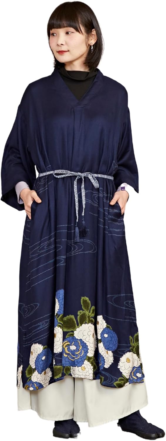 [倭物や Kaya] Kimono One-Piece Dress Winter Peony/Japanese Classical Casual Dress Retro 7IA-1107 Lady's Navy