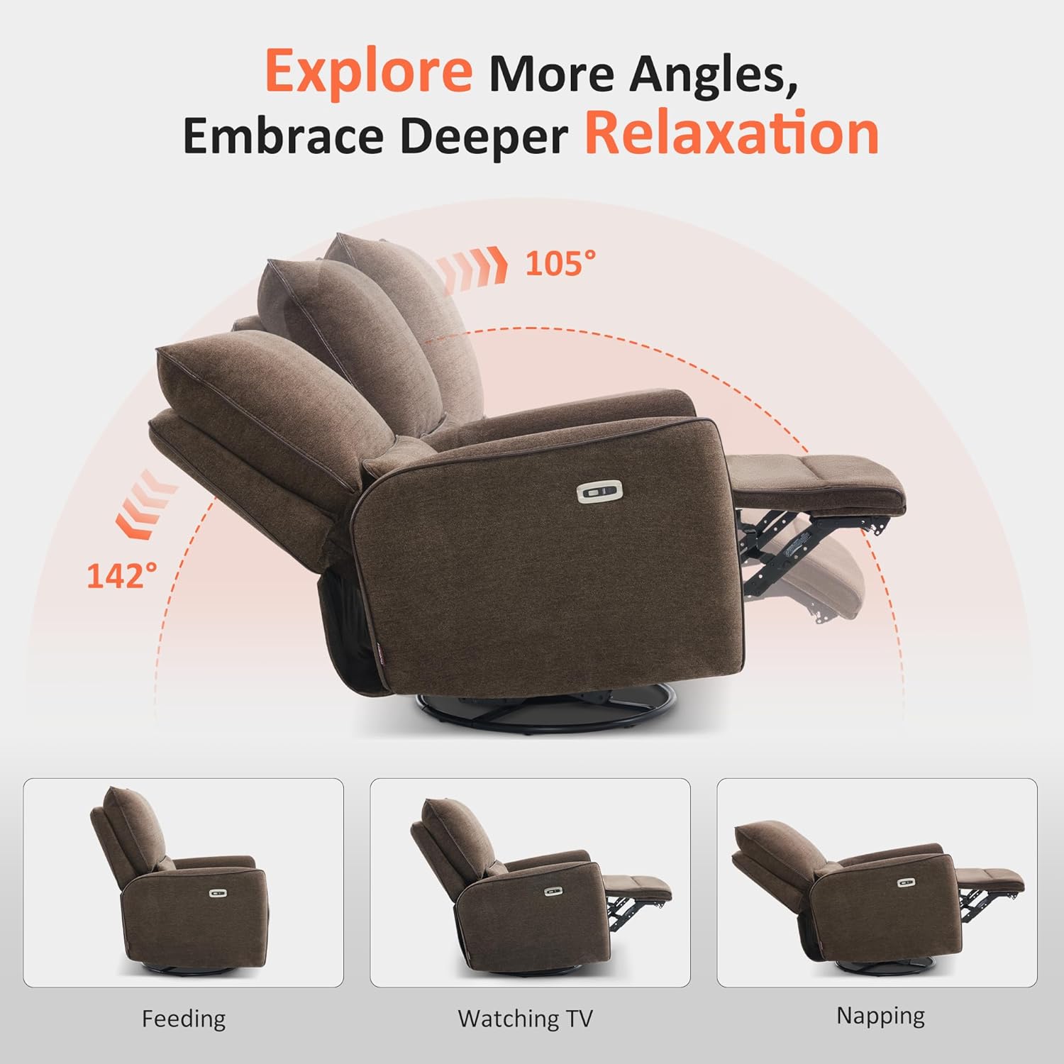 Power swivel glider rocker recliner: Swivels 270°, glides smoothly, electric reclining up to 142°, ideal for nursery or living room. A suitable choice for the nursery and a great addition to the living room.