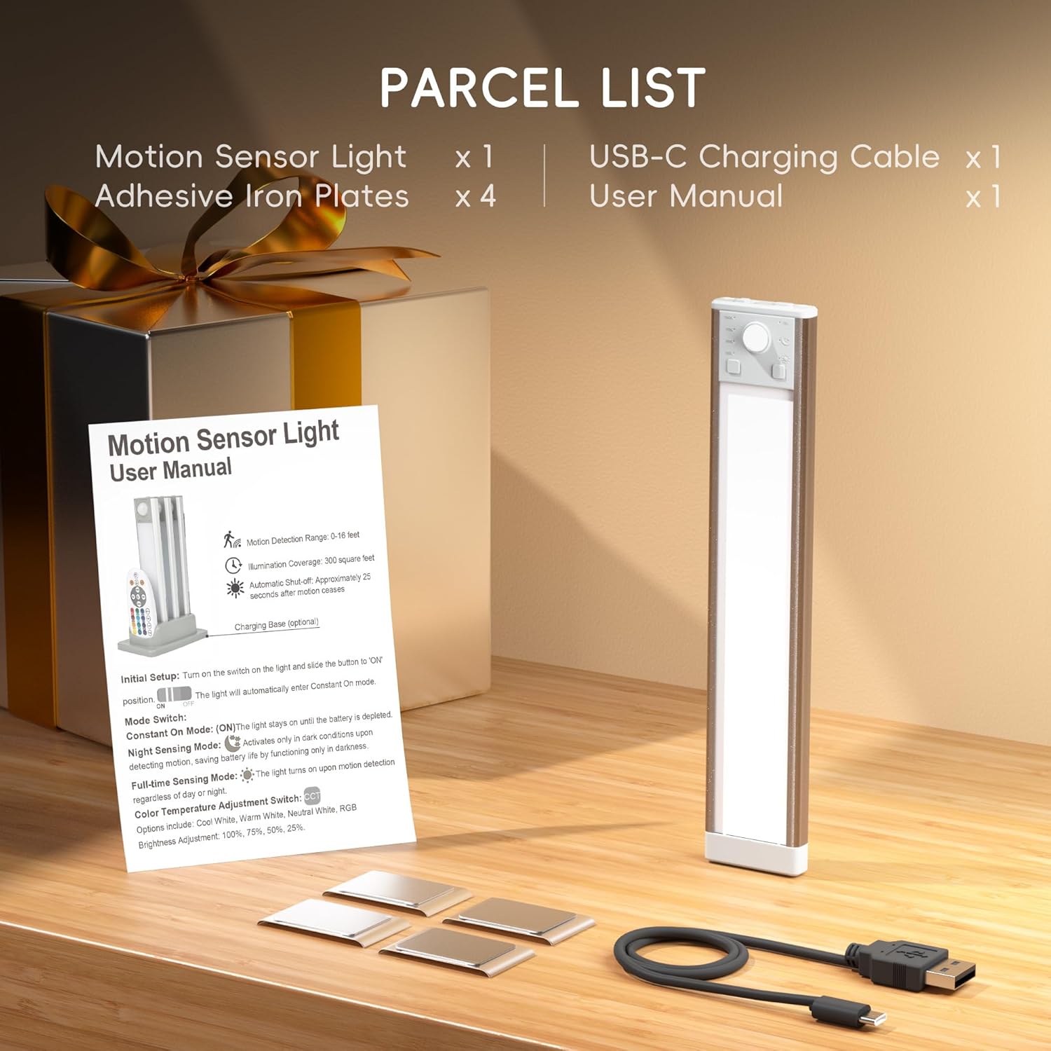 【What You Get】You will receive: 1*lexall cabinet lights, 1*user manual, 4*adhesive iron plates, 1*USB charging cable. Get one right now for your loved one. Add convenience to your home life.