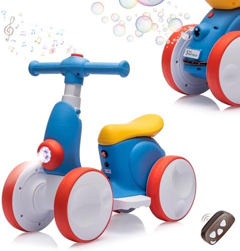 Multi-functional Kids Balance Bike for Children to Play: The thoughtful design includes bubble devices, light effects, music functions, and whistles, adding more fun to the driving experience. Parents can ensure safe driving directions using the remote control. The use of plastic material instead of metal makes the ride-on toy lighter, more compact, and easy to store and carry. The non-slip, wear-resistant wheels are gentle on floors and allow the baby to ride indoors or outdoors.