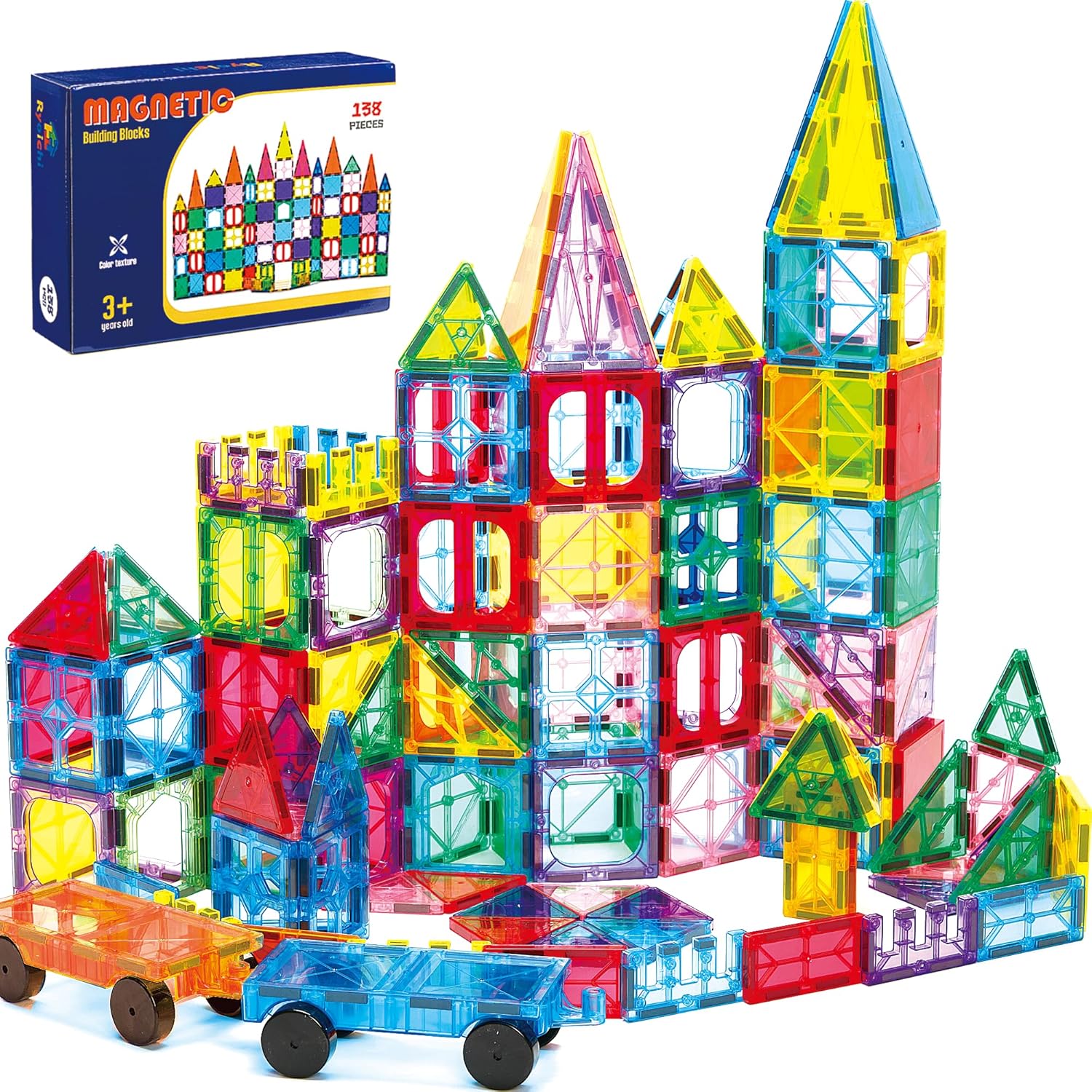 Perfect Magnet Construction Blocks: This 3D magnetic construction block kit contains 138 pieces, including two cars and a storage bag.. Youngsters can construct anything they want without any limitations, and they have more fun. This magnetic block set is a great present for boys and girls in the ages of 3 4 5 6 7 8 9.