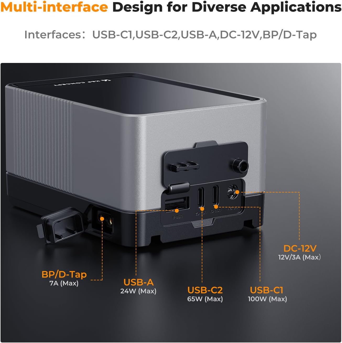 Multiple Interfaces for Various Applications: this 99Wh mini V-mount battery comes with dual USB-C (PD 100W & PD 65W), USB-A(24W max), 12V DC, BP and D-tap ports to power up various devices as DSLR cameras, camcorders, field monitors, video lights, laptops, tablets, etc.