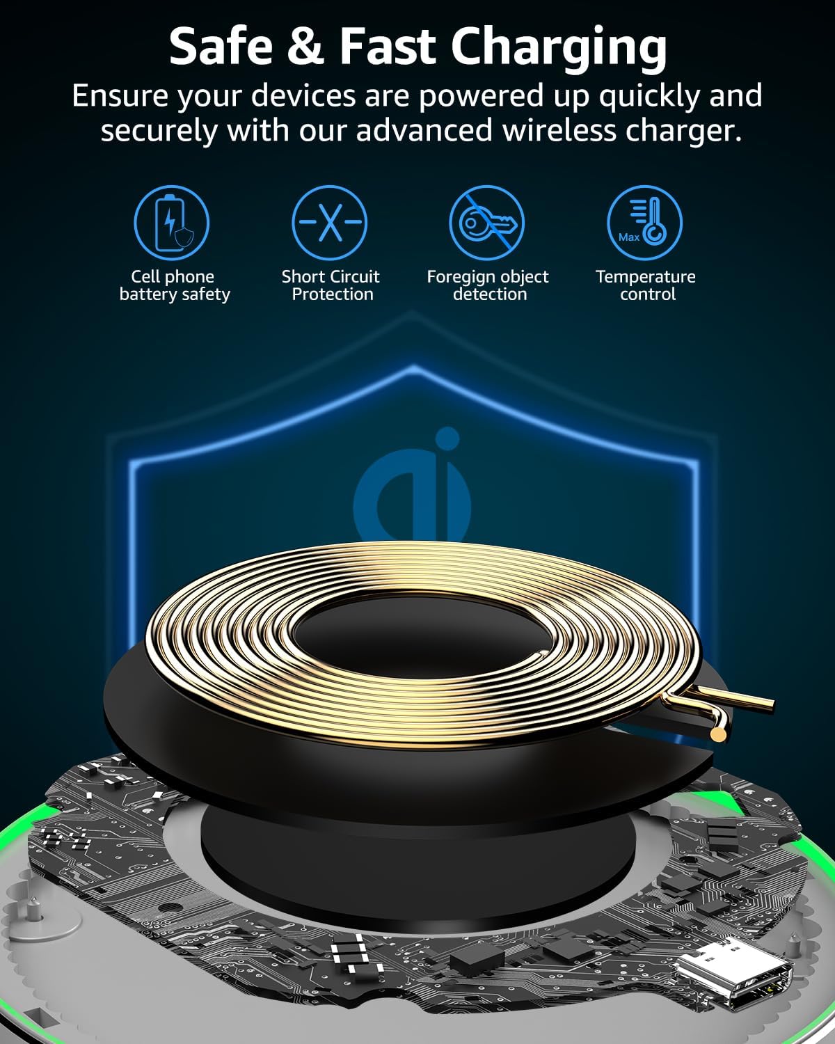 【Sleep-Friendly LED Indicator and Safe to Use】The wireless charger will light up blue for 10 seconds and then turn off during charging, quietly uses LED lights to display charge status, allowing undisturbed sleep with no notification sounds.With built-in protections against over-voltage, over-temperature, over-current, short-circuit, and other potential hazards, it keeps your device's battery safe from overcharge damage.