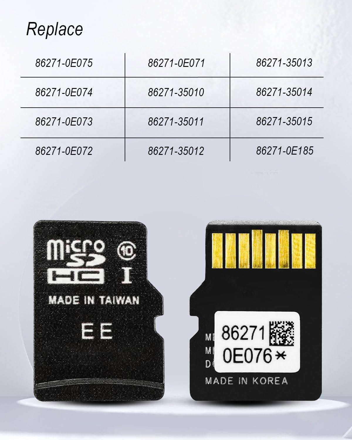 Fitment Fit for 4Runner 2014 2015 2016 2017 2018 Fit for Avalon 2015 2016 2017 2018 Fit for Camry 2013 2014 2015 2016 2017 Fit for Corolla 2014 2015 2016 2017 2018 2019 Fit for Highlander 2014 2015 2016 2017 2018 2019 Fit for Mirai 2016 2017 2018 Fit for Prius 2016 2017 2018 Fit for Prius c 2015 2016 2017 2018 Fit for Prius Prime 2017 2018 Fit for Prius v 2015 2016 2017 Fit for RAV4 2013,2014 2015 2016 2017 2018 Fit for Sequoia 2013,2014 2015 2016 2017 2018 2019 2020 Fit for Sienna 2014 2015 2016 2017 Fit for Tacoma 2011 2012 2013 2014 2015 2016 2017 2018 2019 2020 Fit for Tundra 2013 2014 2015 2016 2017 2018 2019 Fit for Venza 2014 2015 2016 Replacement Part Number Replace 86271-0E076 86271-35010 86271-35011 86271-35012 86271-35013 86271-35014 86271-35015 86271-0E185 86271-0E071 86271-0E072 86271-0E073 86271-0E074 86271-0E075 Features of Navigation Sd Card Comprehensive upgrade of road information SD navigation card has a small size and light weight Compatible with multiple vehicle models, allowing more car owners to enjoy the upgrade of navigation maps Easy to install, the vehicle is in a stationary state for more than 10 minutes. Insert the card, start the vehicle, and then wait for the program to upgrade on its own