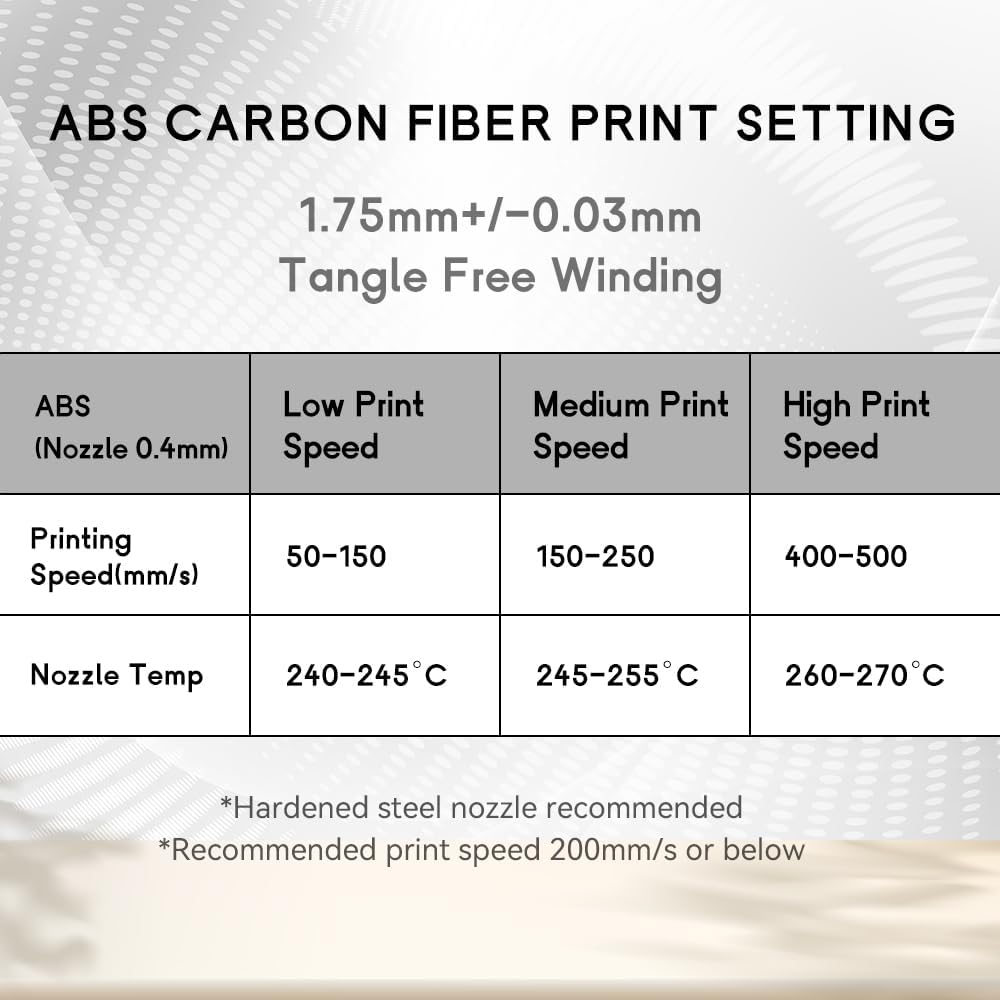 【CONSEJOS PARA IMPRIMIR】Debido a la adición de fibra de carbono, este filamento puede desgastarse y obstruir rápidamente los boquillas de latón de 0.4mm. Se recomienda altamente una boquilla de acero resistente a la abrasión de diámetro más grande (0.6mm o más), y mantener las boquillas limpias entre varias impresiones. Para un mejor acabado y adhesión de capas, también sugerimos secarla antes de imprimir. Temp. de Impresión: 250°C - 255°C, Temp. de la Cama: 90-100°C, Velocidad del Ventilador: 0%, Velocidad de Impresión: 40-150mm/s.