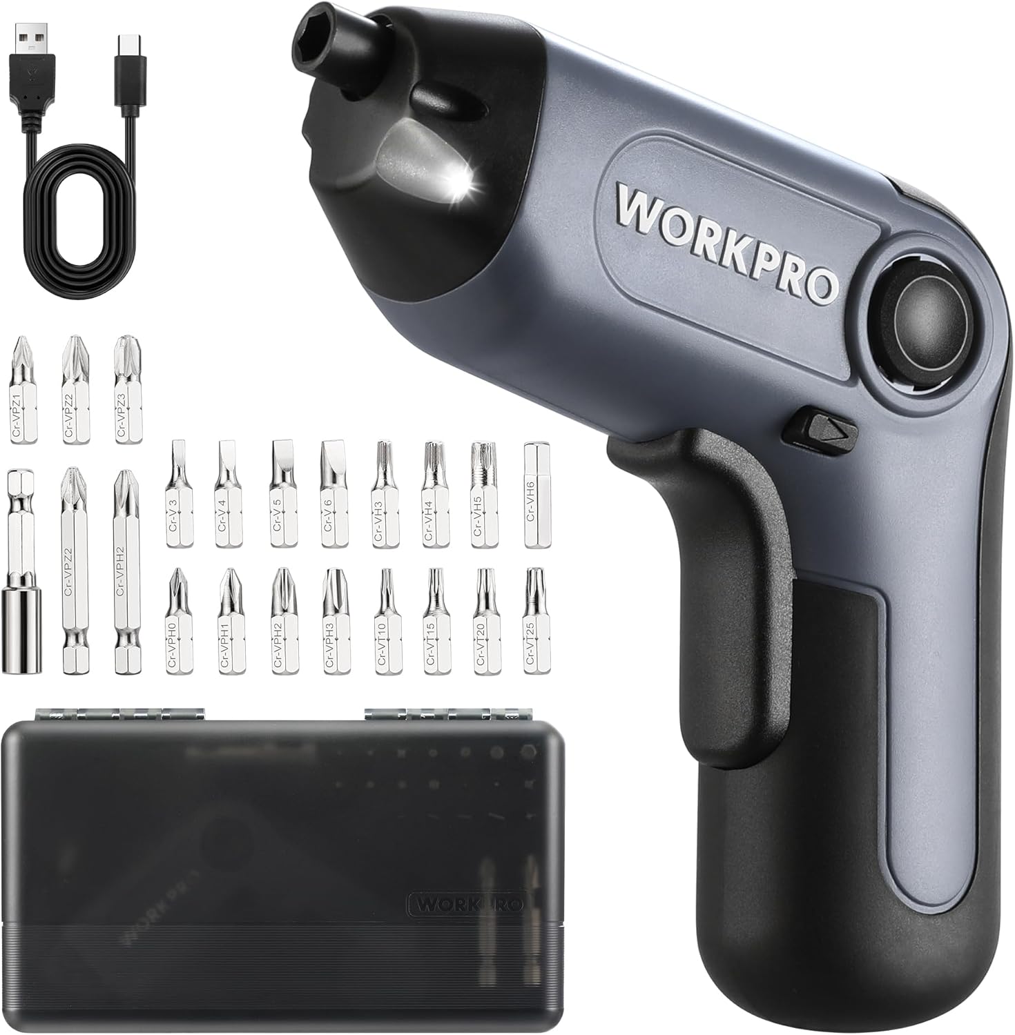 WORKPRO Electric Cordless Screwdriver with Offset Driving Shaft, 3.6V Automatic Rechargeable Screw Driver with 22PCS Bits, Battery Powered Automatic Screw Gun with LED Light & Carrying Case