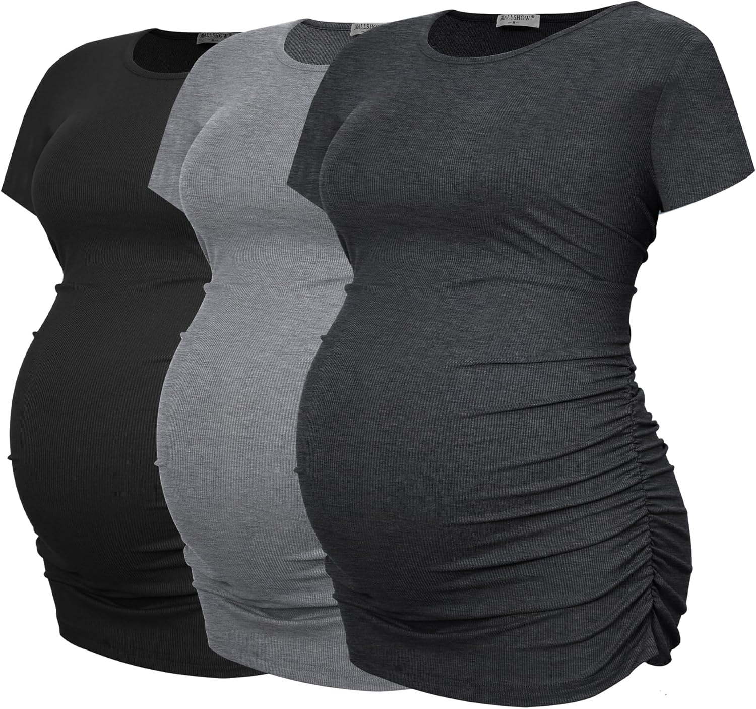 Smallshow Women's Maternity Shirts Ribbed Ruched Pregnancy Clothes Tops 3 Packs