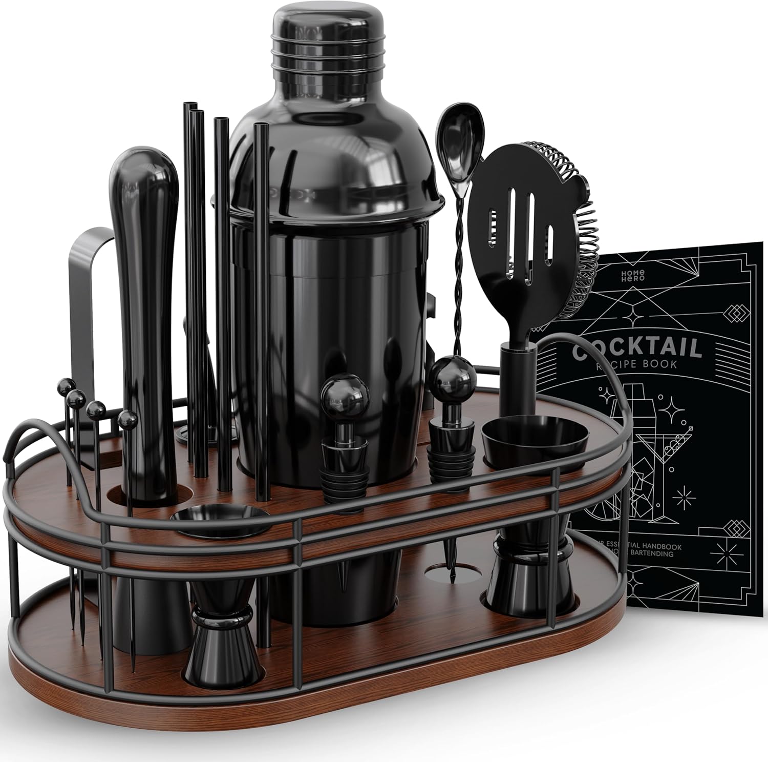 Home Hero Elegant Bartender Kit with Wooden Stand, Premium Bar Set & Cocktail Shaker, Gift for Home Bar and Cocktail Enthusiasts, Essential Bar Accessories with Recipe Book (22 Pcs - Black)