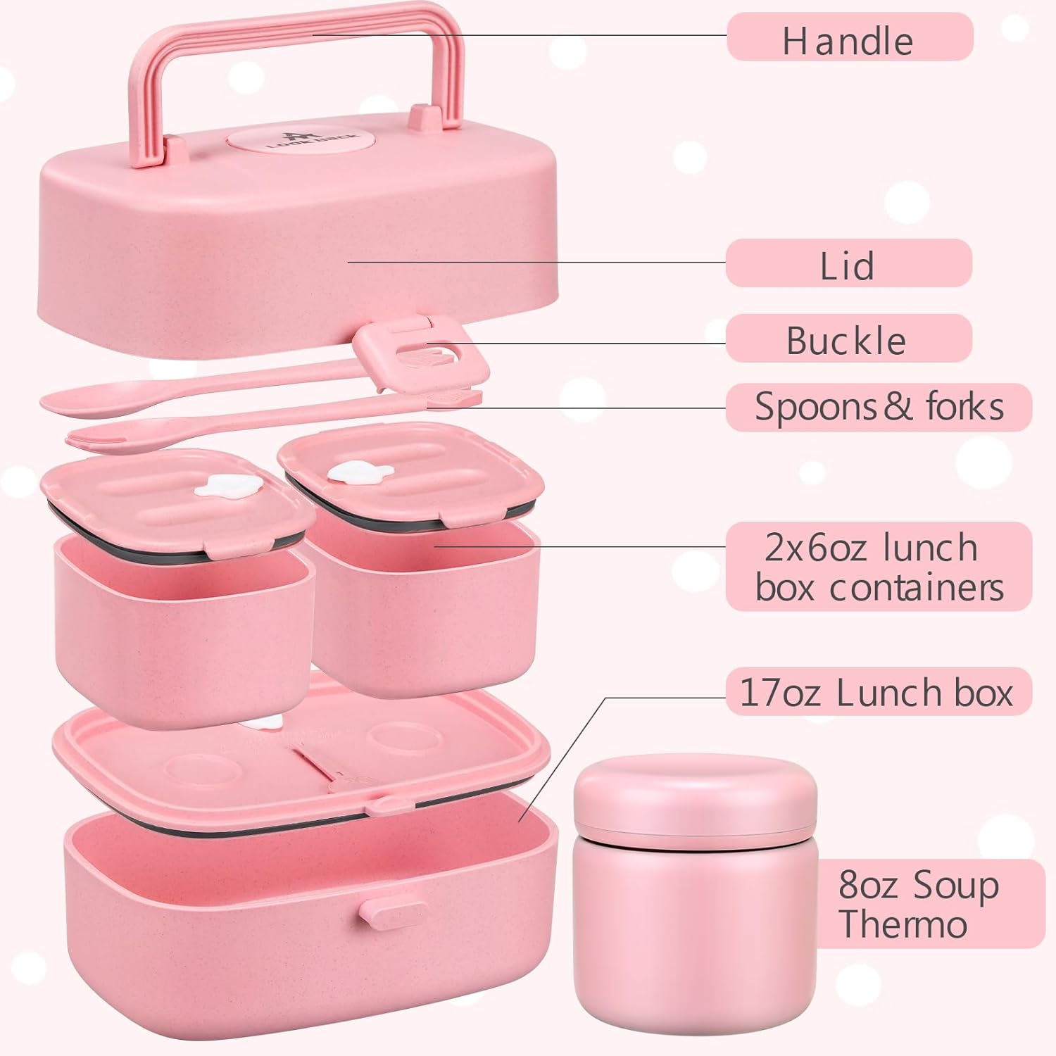 Bento Lunch Box for Kids with 8oz Soup Thermo,2 Leak-Proof Food Containers, a Lunch Bag, Kids Thermo Insulated Hot Food Jar for School, Travel-Pink