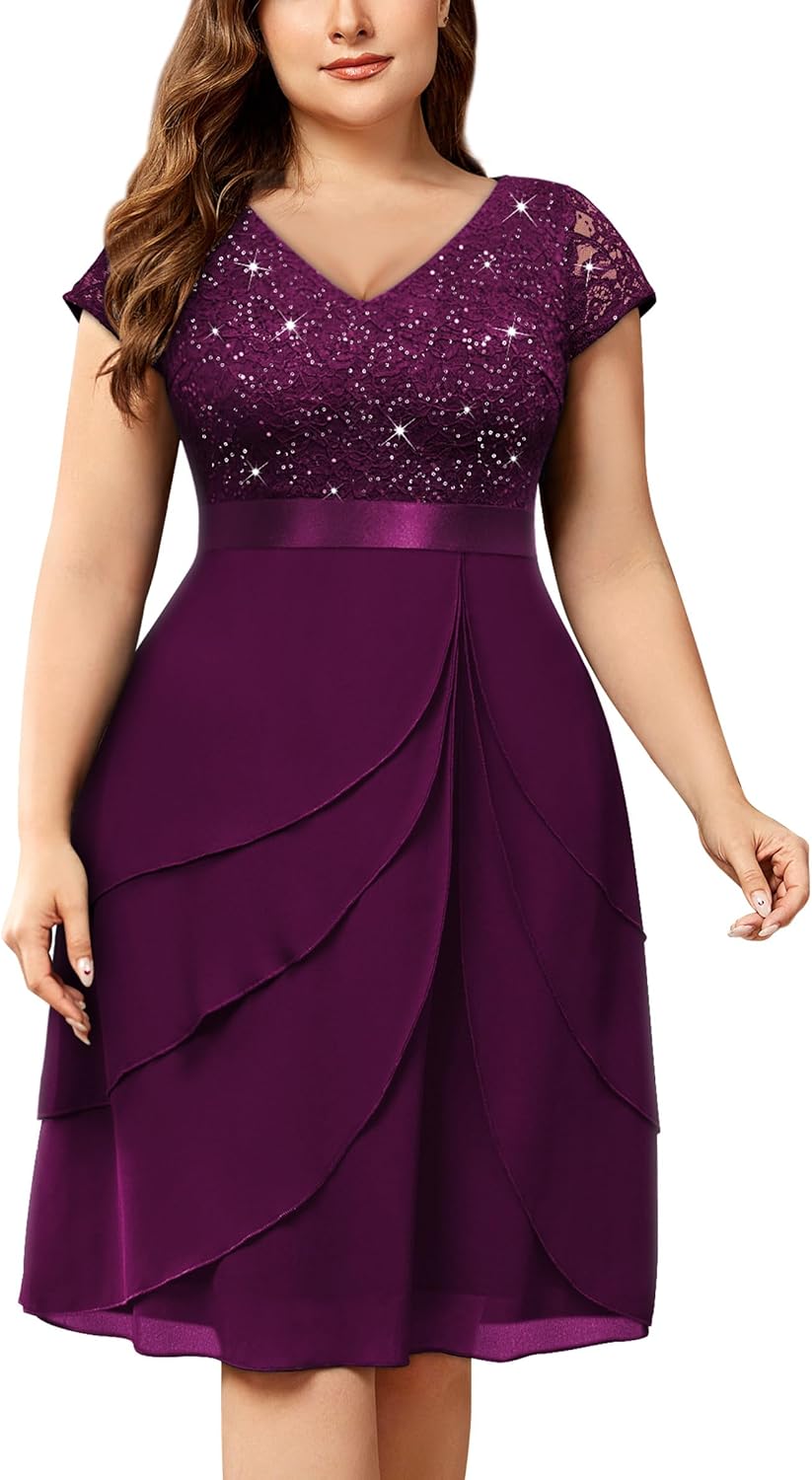 Miusol Women's Plus Size Sequin Lace V Neck Ruffle Tiered Chiffon Cocktail Party Dress