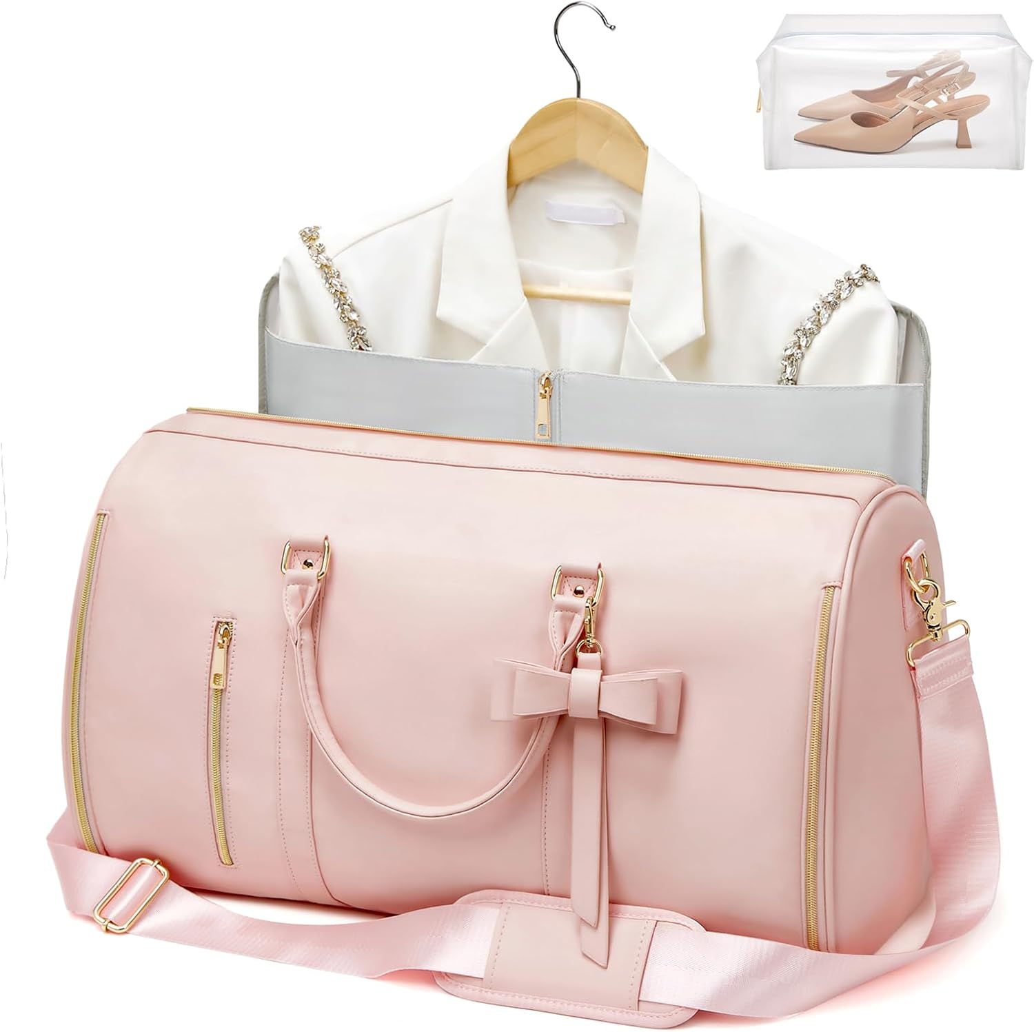 Garment Bags for Travel, Convertible Suit Travel Bag for Women, Fashion & Cute Carry On Garment Bag w/Shoes Pouch, 2 in 1 Foldable PU Leather Hanging Duffle Bag, Single-Zipper Design, Pink