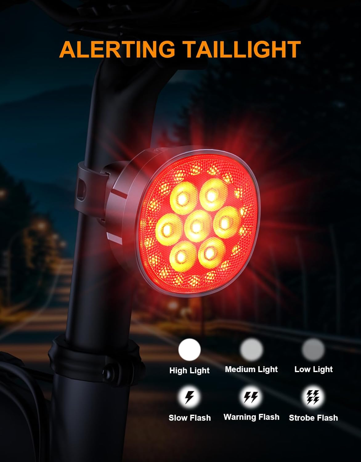 [Ultra Bright Light Combination] Featuring Spot and Flood Beam Combo Design, these bicycle lights are equipped with 7 powerful main LEDs and 18 surrounding auxiliary LEDs. There are two independent light controls, that can be configured for various modes (headlight 2X4 + rear light 2X6), including high, medium, low, and several flash modes. Very convenient for you to switch freely.