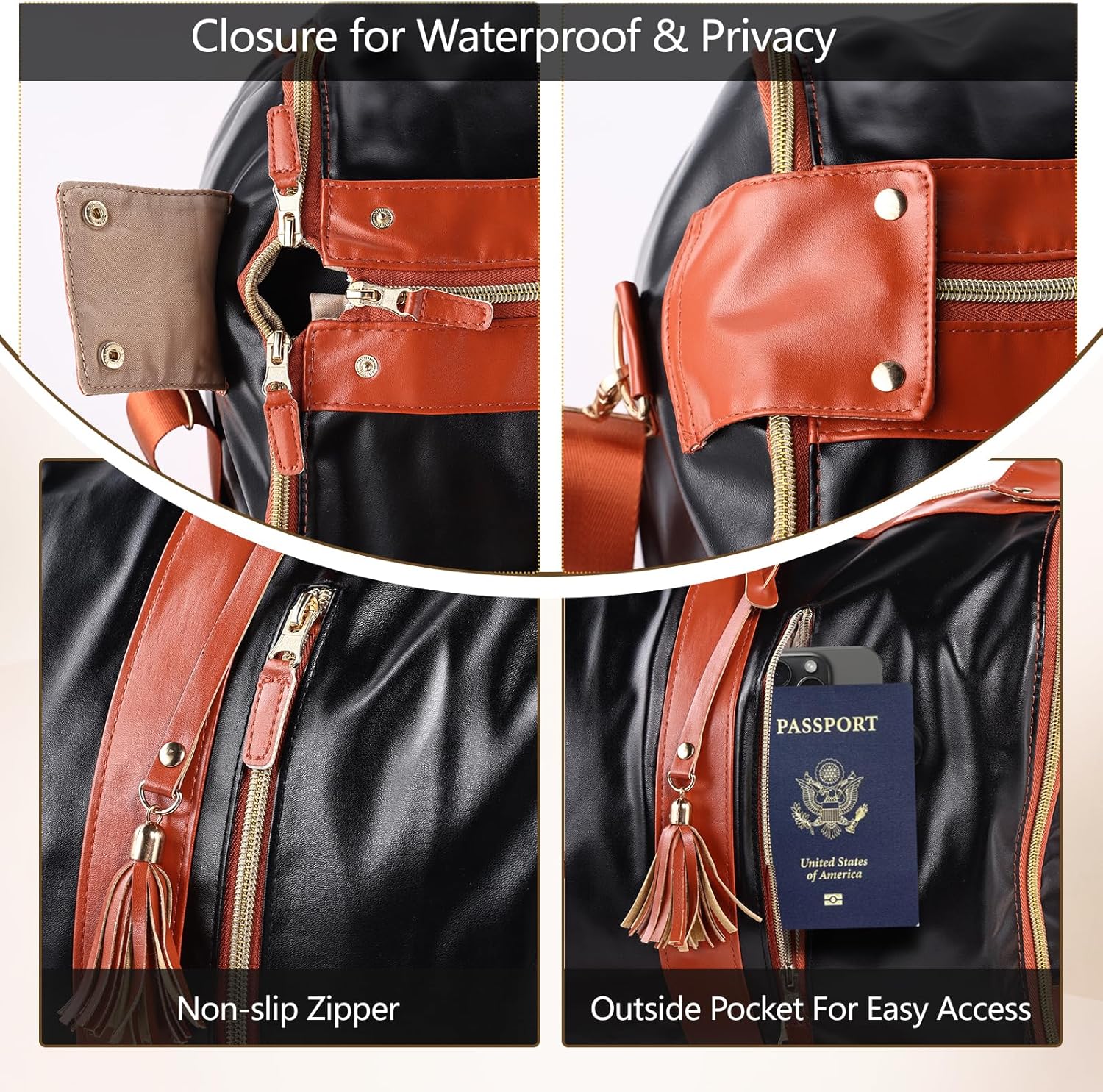 【High Quality Material】Travel suit bag is made of high quality super-fiber waterproof PU leather, and the zipper intersection is also designed with a closure, give the bag a better splash-proof function and fashion sense. The garment duffle bags for travel women uses a non-slip zipper. The zipper will not automatically slide down and cause embarrassing exposure of items