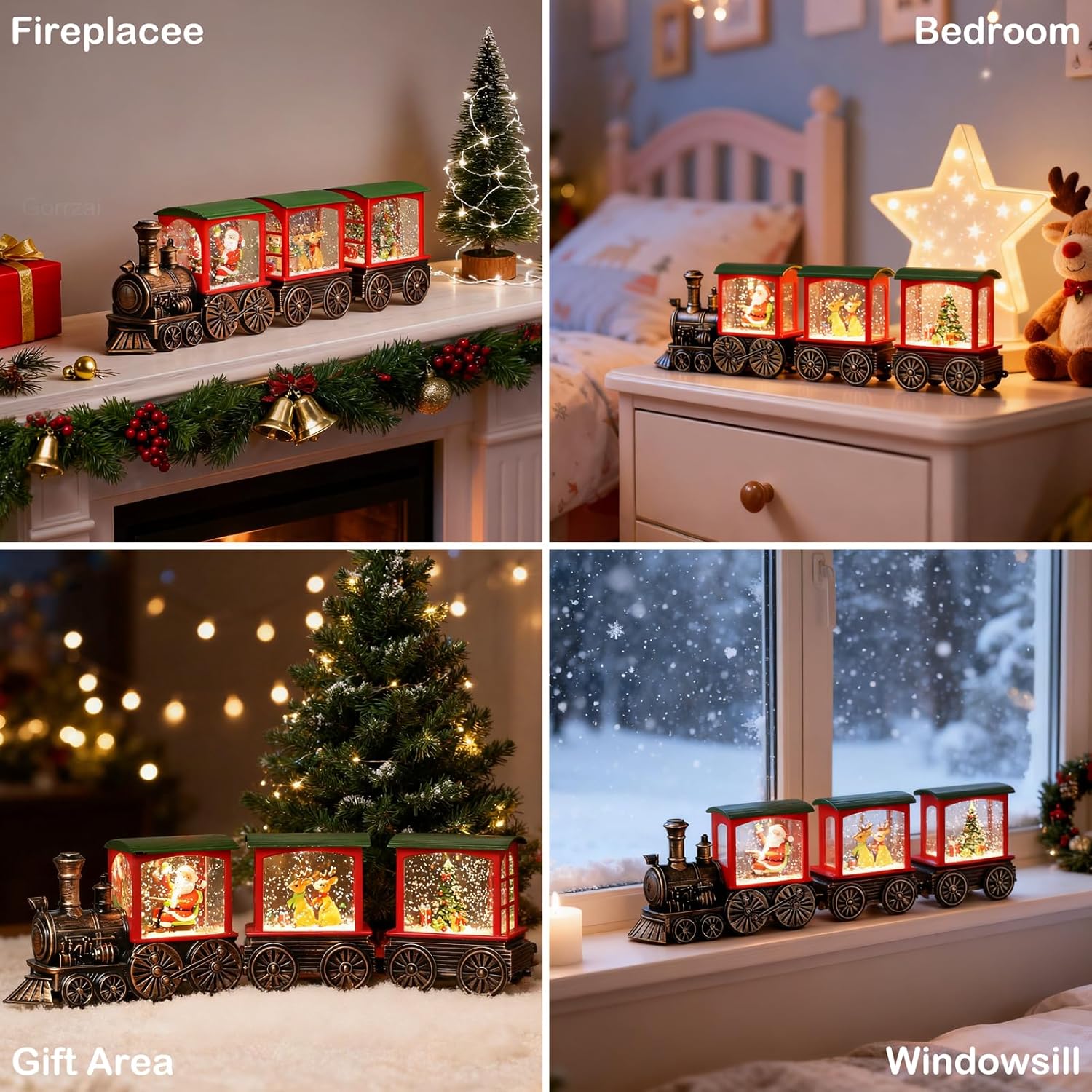 Train Snow Globe Christmas Snow Globe Lantern with Auto 6H Timer and Manual Glitter, Lighted Christmas Decorations Indoor with Santa Claus Reindeer Tree for Home Tabletop, Battery Operated