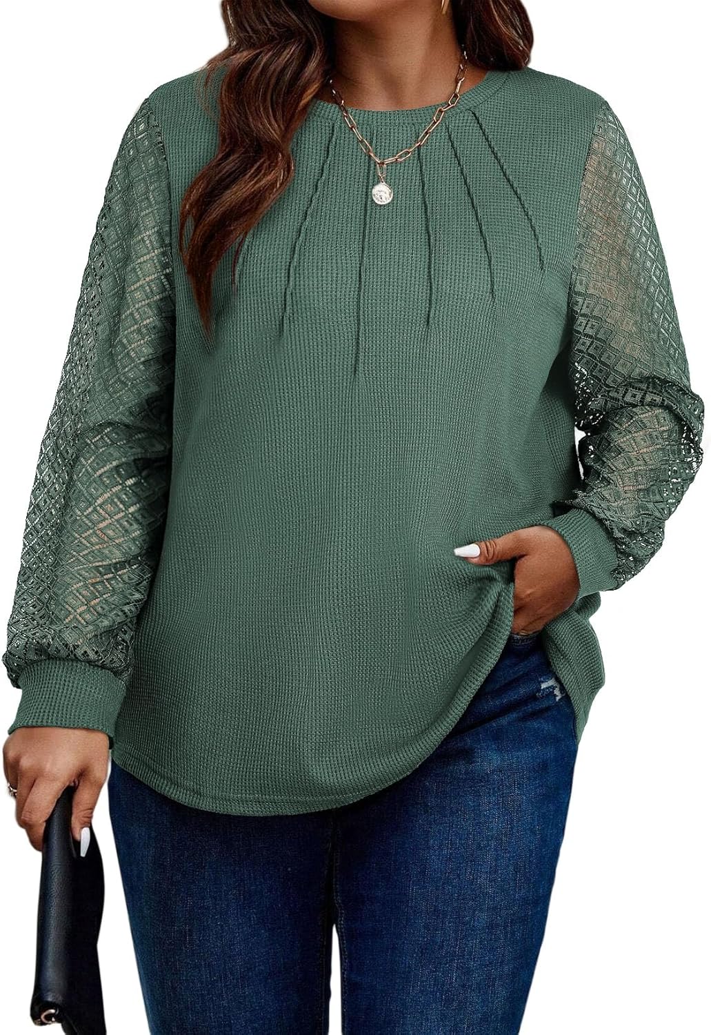 Eytino Womens Plus Size Tops Lace Long Sleeve Waffle T Shirts Casual Crewneck Tunic Tops(1X-5X)