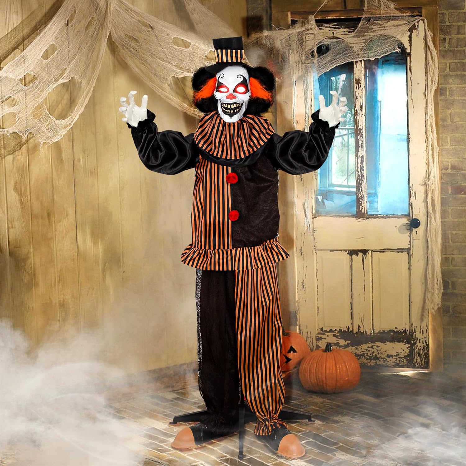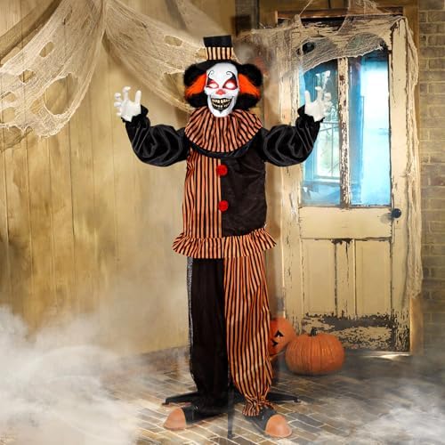 67” Halloween Animatronics Standing Clown with Light-up Eyes, Sound & Touch Activated Creepy Sounds, Life-Size Halloween Decoration - Perfect for Haunted House Props, Indoor/Outdoor Halloween Decor