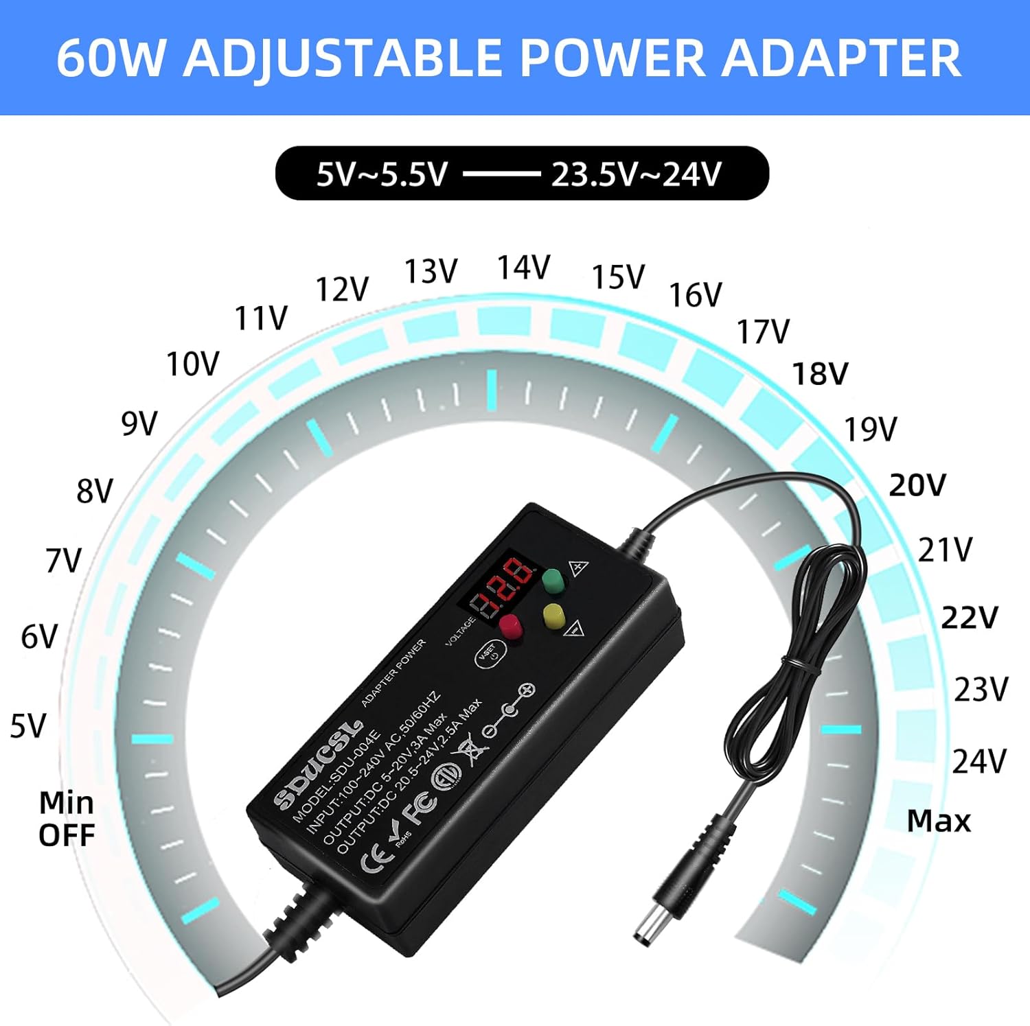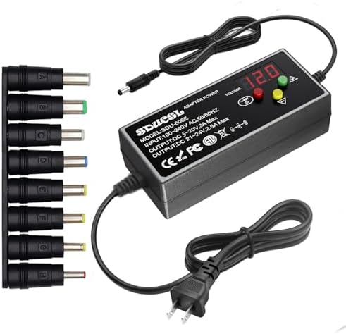 【Adjustable Power Supply】AC 100~240V, 50/60Hz ; Output: DC 5~24V Adjustable, Max 3A 60W ; It can supply with any voltage between 5-24V,such as 5V 5.5V 6V 9V 12V 13.5V 15V 16V 18V 19V 20V 24V, etc and any amp less than 3A, such as 300mA, 500mA, 650mA, 1A, 1.5A, 3A. LCD display will show the output voltage, in case that wrong voltage regulation damage your device