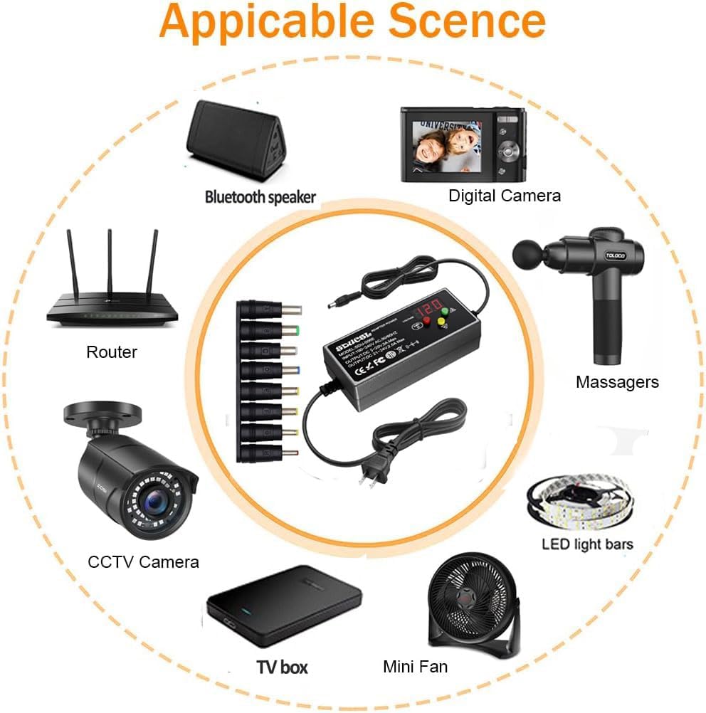 【Upgraded Version Power Adapter】The variable power supply innovatively uses 3 buttons to achieve adjustable voltage , which is more reliable and safer than traditional knob-type adjustable dc power supply.Universal power supply with adjustable DC output, providing versatile charging options for a wide range of devices