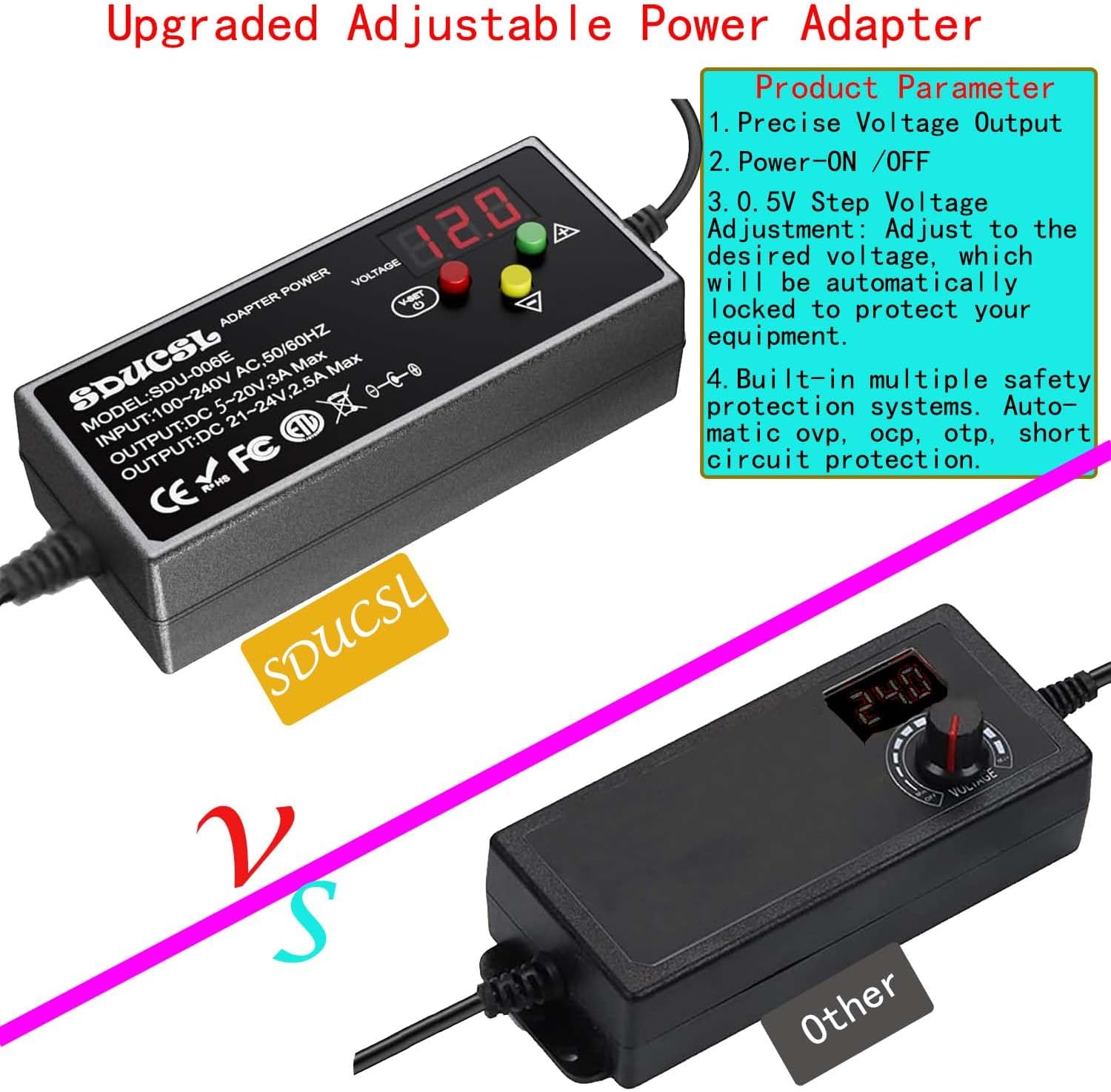 【Safety Design】Built-in protruding 3 button for adjusting the voltage suitable for your device,the LED displays real-time voltage,which helps you control real-time condition of power supplying. Built-in multiple safety protection systems.Automatic over voltage cut-off, over current cut-off,over temperature cut-off,short circuit cut-off.No noise, no spontaneous combustion,no explosion,no fire hazard,safe to use
