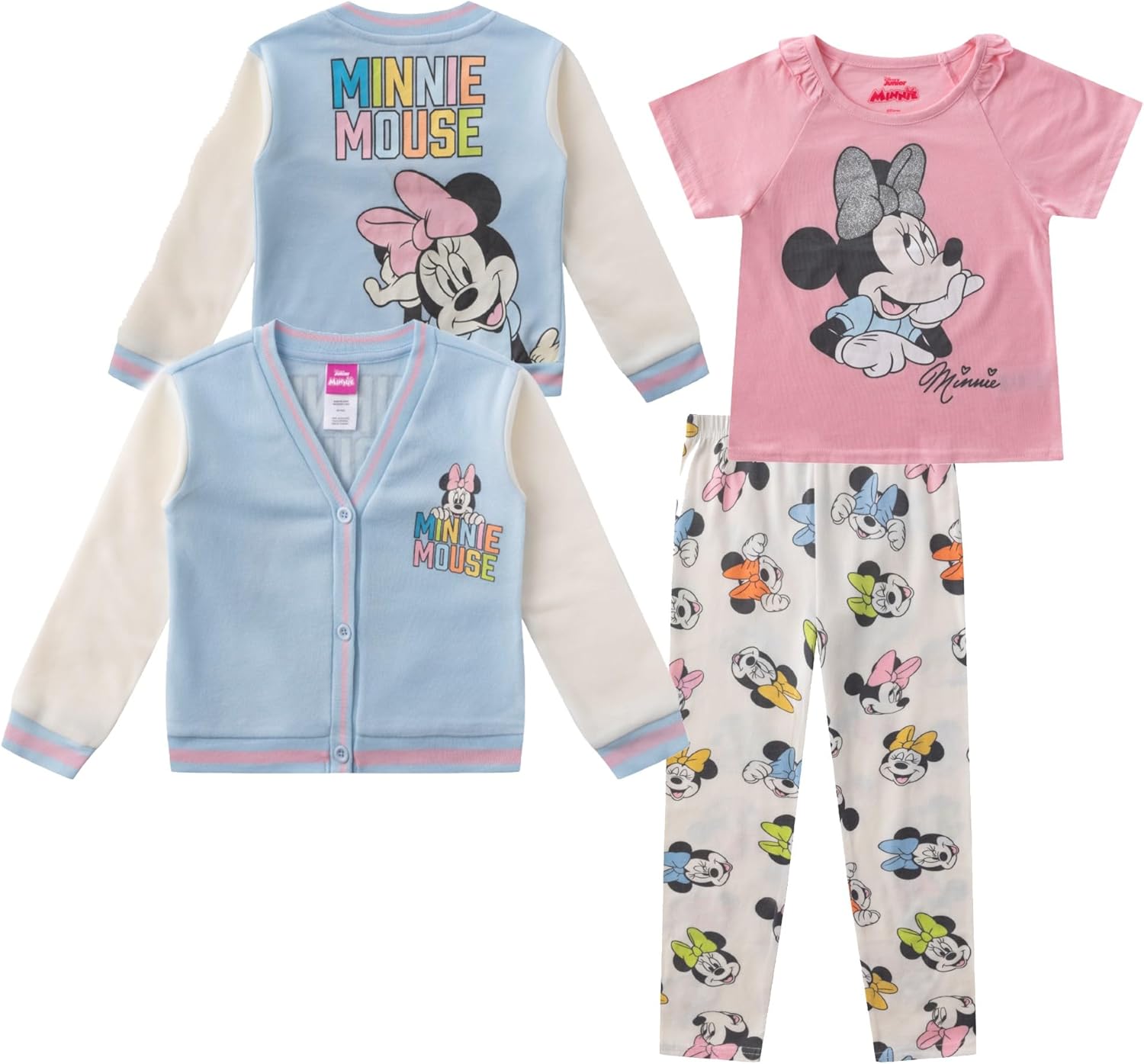 Disney Minnie Mouse Girls Pants set with Varsity Cardigan, and Short Sleeve T-Shirt 3 Piece Set for Toddler to Big Kids
