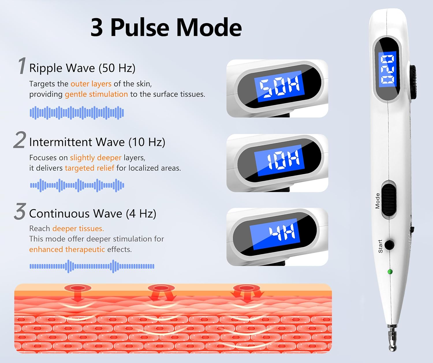 3 MODE: 1) Ripple wave (50 Hz): Targets the outer skin Layers with gentle stimulation. 2) Intermittent wave (10 Hz): Penetrates mid-layer tissues for localized relief. 3) Continuous wave (4 Hz): Reaches deeper tissues with enhanced therapeutic stimulation.