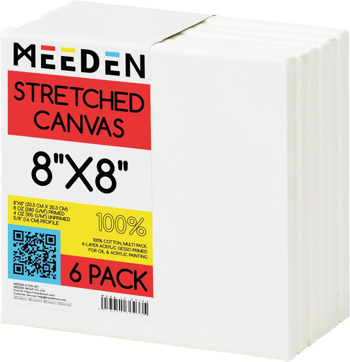 MEEDEN Stretched Canvas, 8 × 8 Inch, Pack of 6, Blank White Canvases for Painting, 100% Cotton, 8 oz Gesso-Primed, Pre-Stretched Canvas for Acrylic Oil Pouring & Airbrushing Painting