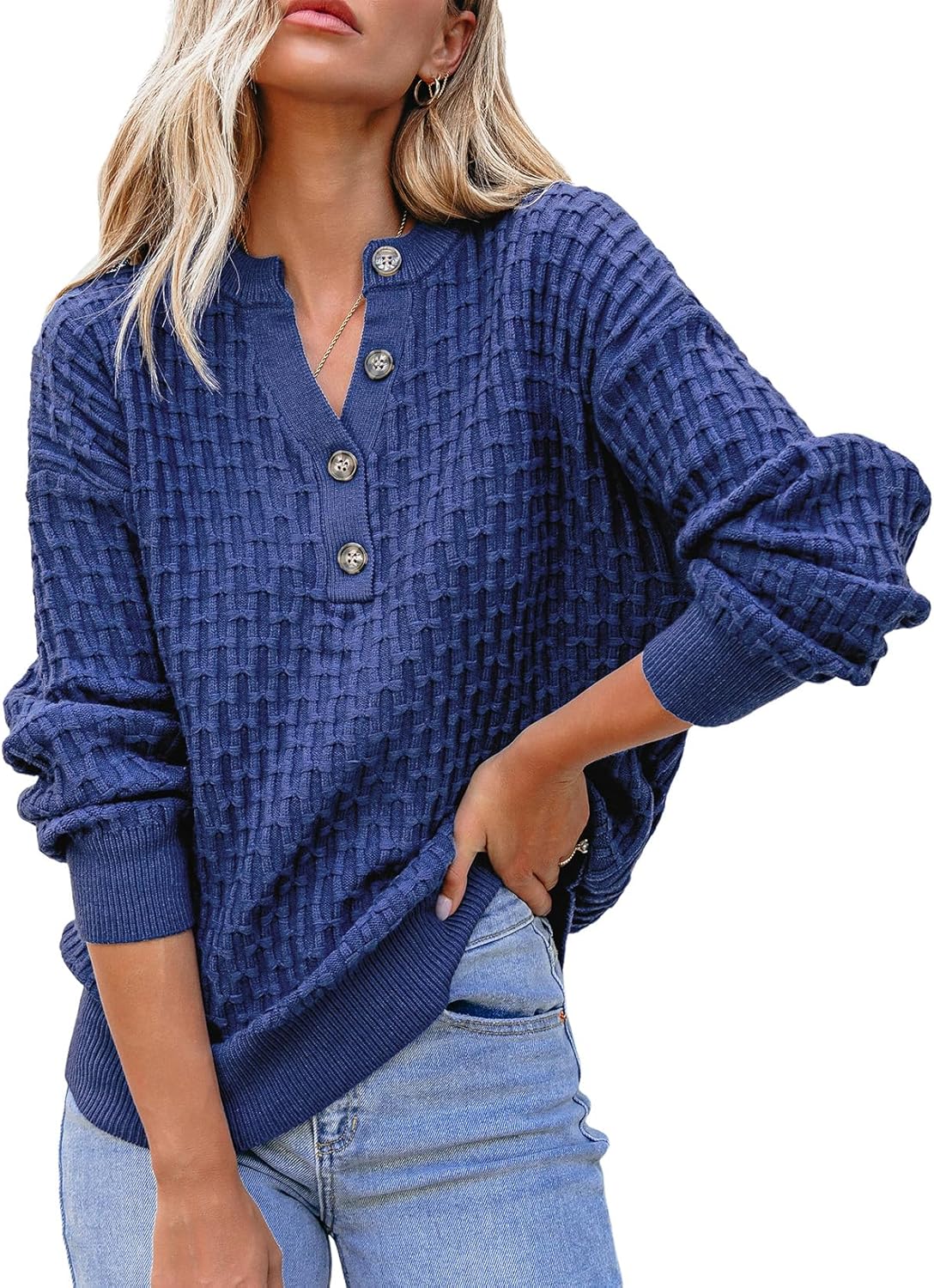 Dokotoo Womens Sweaters 2025 Casual Long Sleeve Henley Shirts V Neck Textured Button Fall Sweater Loose Fit Jumper Tops