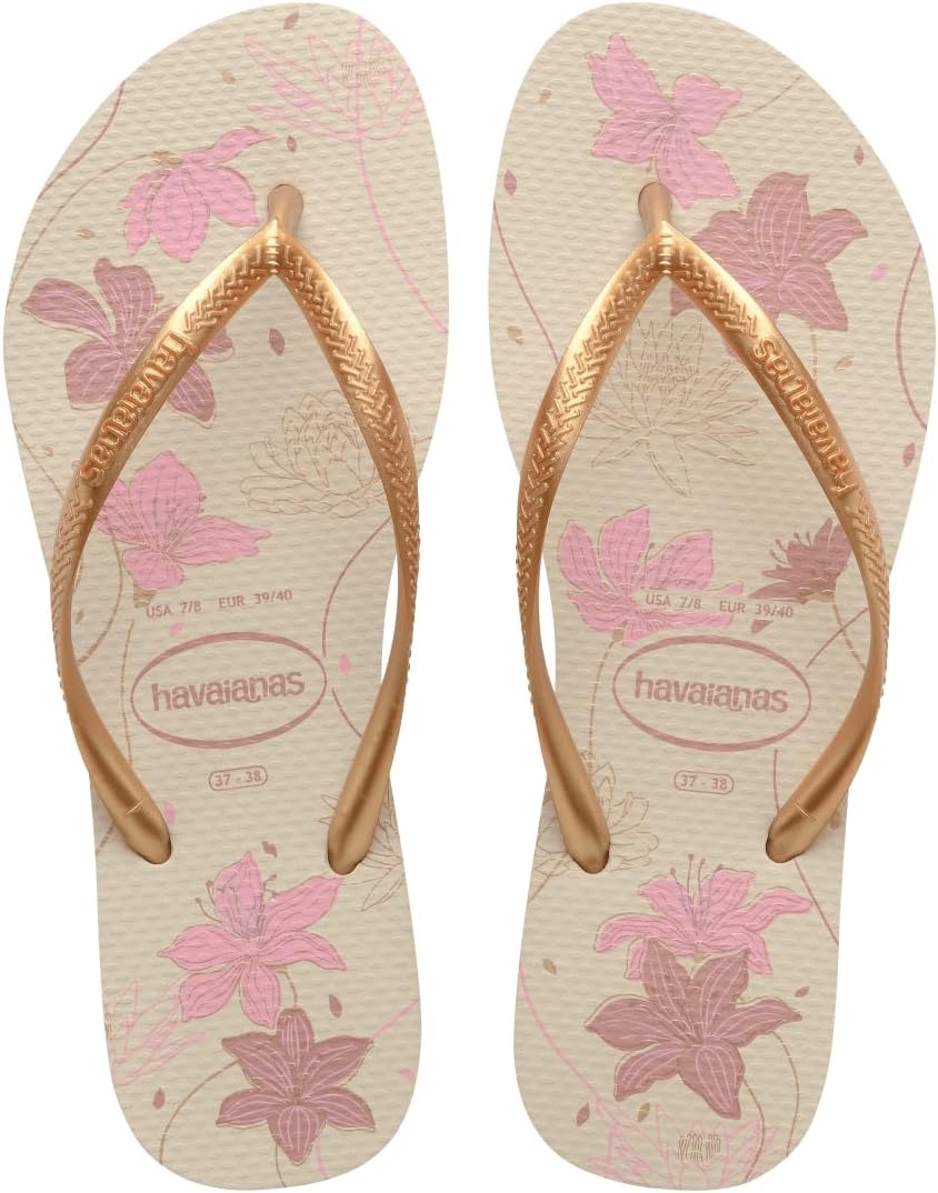 Delicate and romantic, the Slim Organic women's flip-flop is one of Havaianas' most classic models. With thinner straps and soles, the sandal also features a touch of sophistication with the metallic straps. Adorned with floral prints, the flip-flop is available in three new colors: choose the one that best suits you.