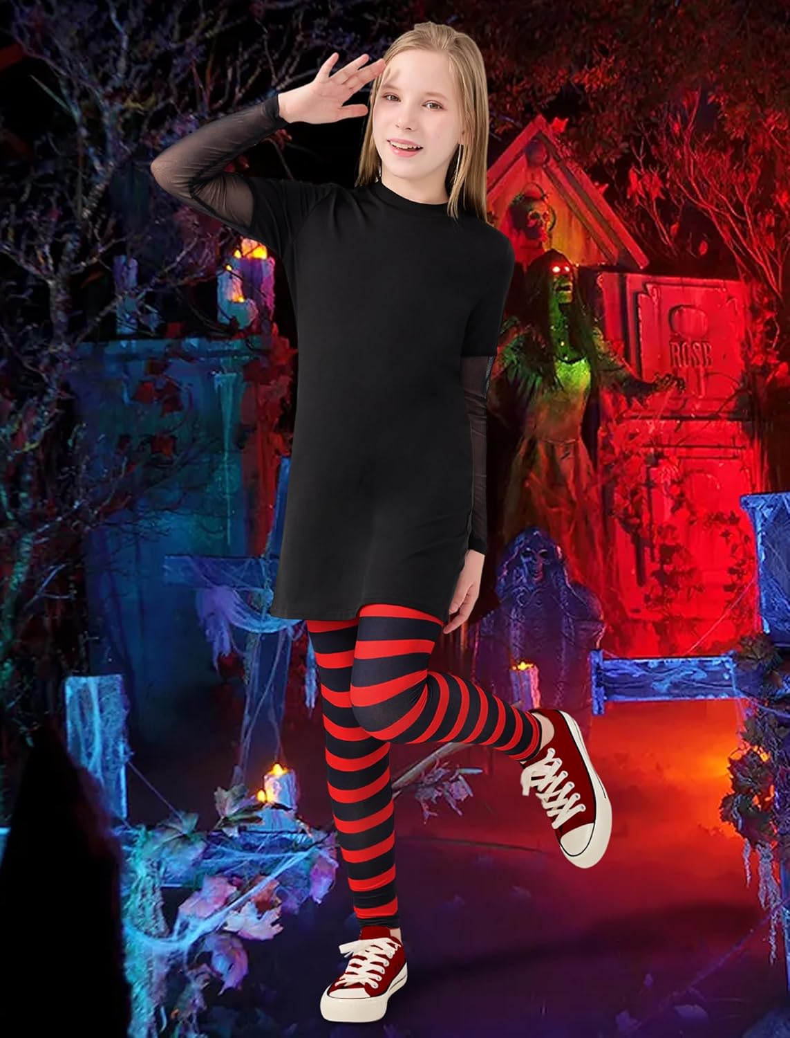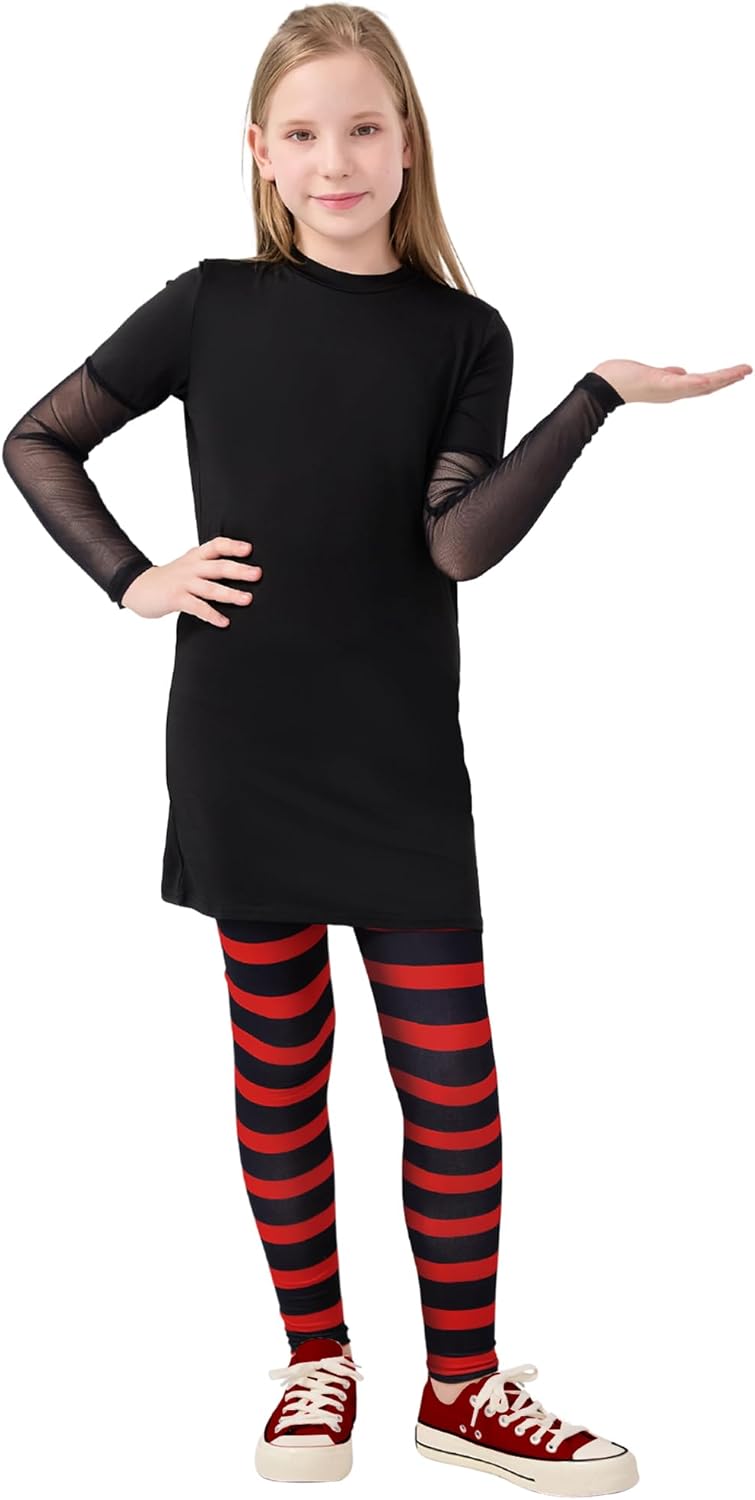 Halloween Girl's Hotel Vampire Mesh Sleeve Black Dress with Striped Leggings 4-14 Years