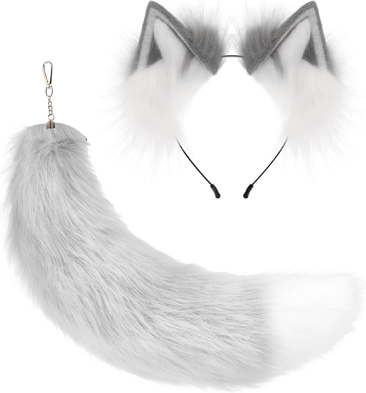 Package Includes: 1 Set Fox Cosplay Costume 1 Pcs Ear Hoop+1Pcs Tail Material: Artificial Fur Size:Ear:20*20CM+Tail:45.5CM Color: Grey+White Our fox cosplay costume with a furry appearance, adjustable ears and tail, easy to dress up. Tails KeyChain You can hang anywhere you want to hang Cosplay You can use it to dress yourself in Halloween Furry Ears Our ears, cats, foxes and wolves are all adapted Wide application of scenarios If you want to participate in Halloween, Animal Cosplay Party, party, try our Fox Cosplay Costume! There will definitely have a wonderful efficiency!