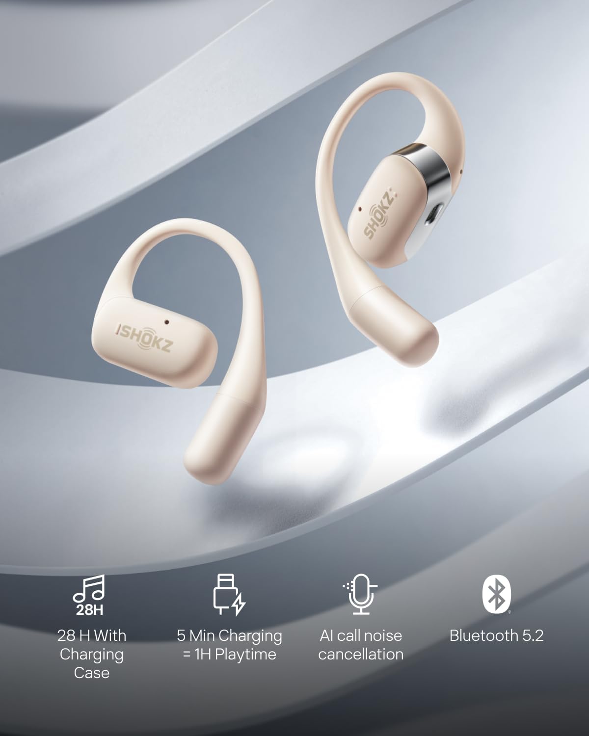 SHOKZ OpenFit - Open-Ear True Wireless Bluetooth Headphones with Microphone, Earbuds with Earhooks, Sweat Resistant, Fast Charging, 28HRS Playtime, Compatible with iPhone & Android (Renewed)