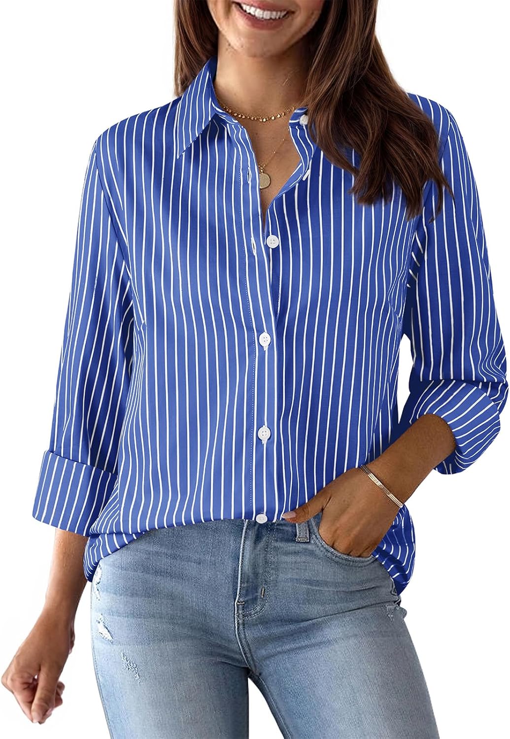 Womens Button Down Shirts Cotton Striped Dress Shirt Long Sleeve Collared Office Work Pinstripes Blouses Tops