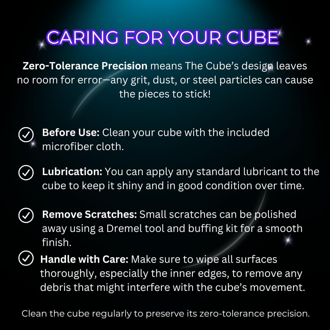 INCLUDES - One 1.5" Wire EDM Cube plus 1 microfiber cloth for cleaning. Its important to clean your cube before use in order for it to move freely and smoothly.