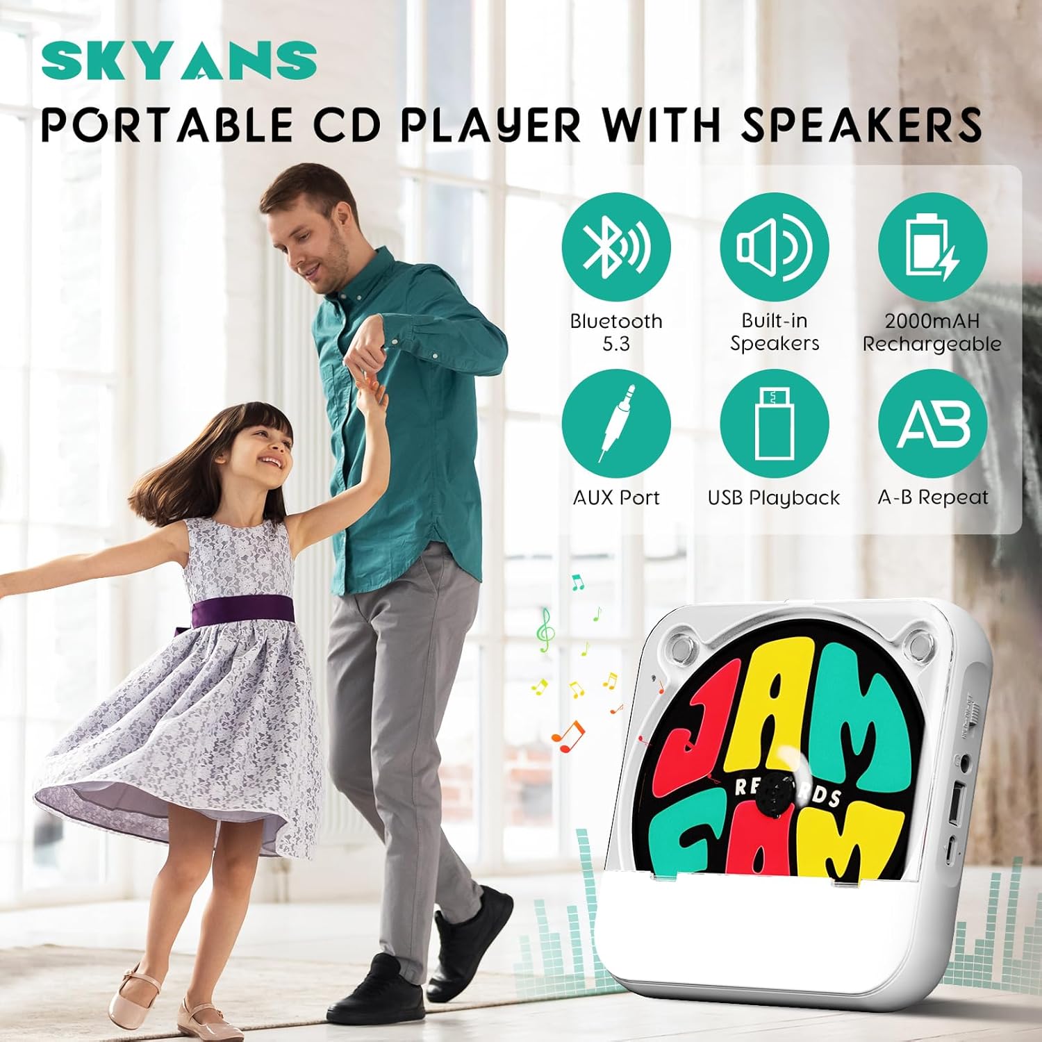 【Rechargeable CD Player】: SKYANS Portable CD Player with build-in 2000mAh rechargeable battery. Saving your purchase of AA batteries and no need to always plug the charging cable into the cd player when playing music, for car , travel, exercise and use when going out