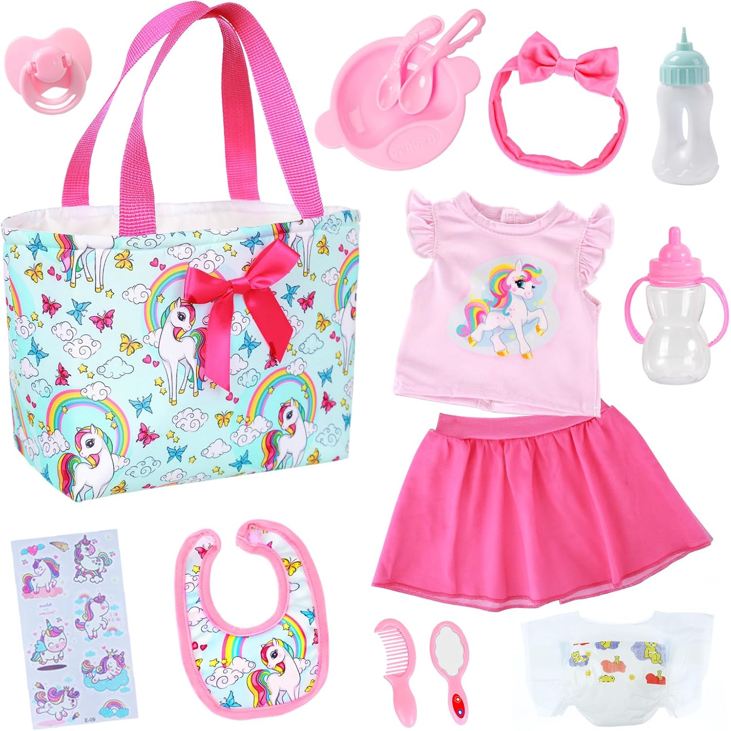 Ecore Fun 15 Pcs Baby Doll Diaper Bag with Clothes and Accessories, Includes 16 Inch Girl Doll Clothes, Bottles, Pacifier, Bib, Diaper