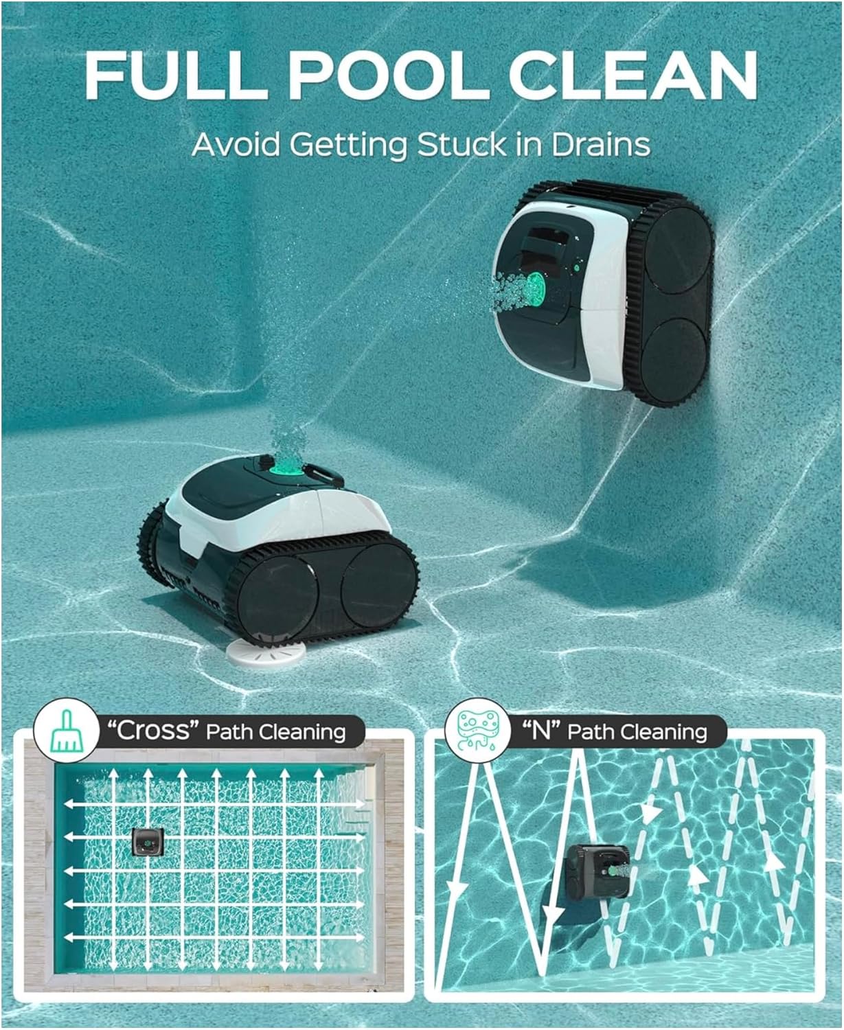 Cobertura Completa con Modos de Limpieza Inteligentes: Diseñado para limpiar el fondo, las paredes y la línea de agua de la piscina, este limpiador robótico para piscinas cuenta con múltiples modos de limpieza y un programa predeterminado inteligente que optimiza el tiempo de funcionamiento. Comienza con la limpieza de paredes y línea de agua, luego pasa a una limpieza exhaustiva del suelo para una cobertura completa de la piscina.