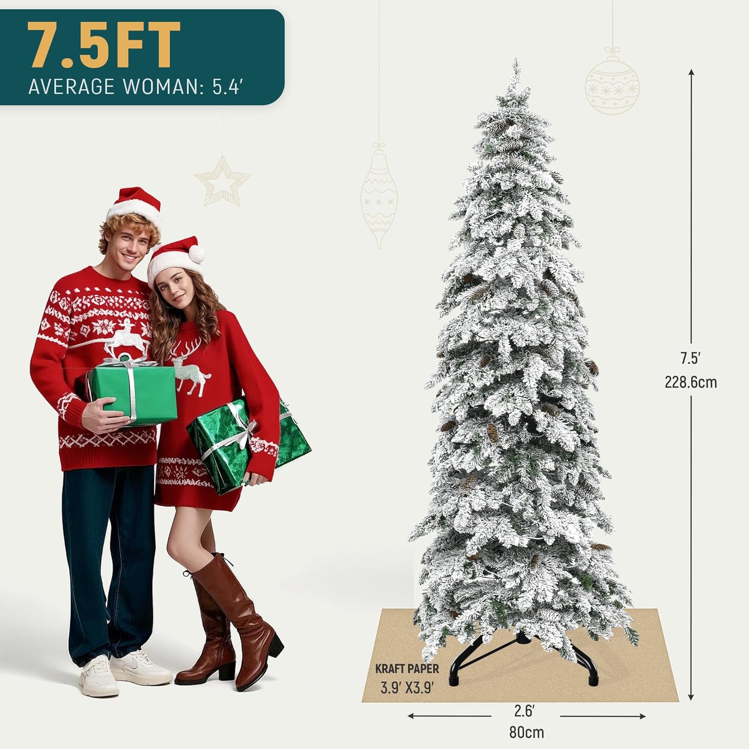 Natural Drooping Pencil Design: Our YITAHOME tree features 800 branch tips, closely resembling a natural layered spruce for a unique look; Covered in white flocking, it adds a special winter ambiance; The elegant pencil spruce doesn't occupy much space, making it for corners and limited spaces, adding excitement and creativity to your life