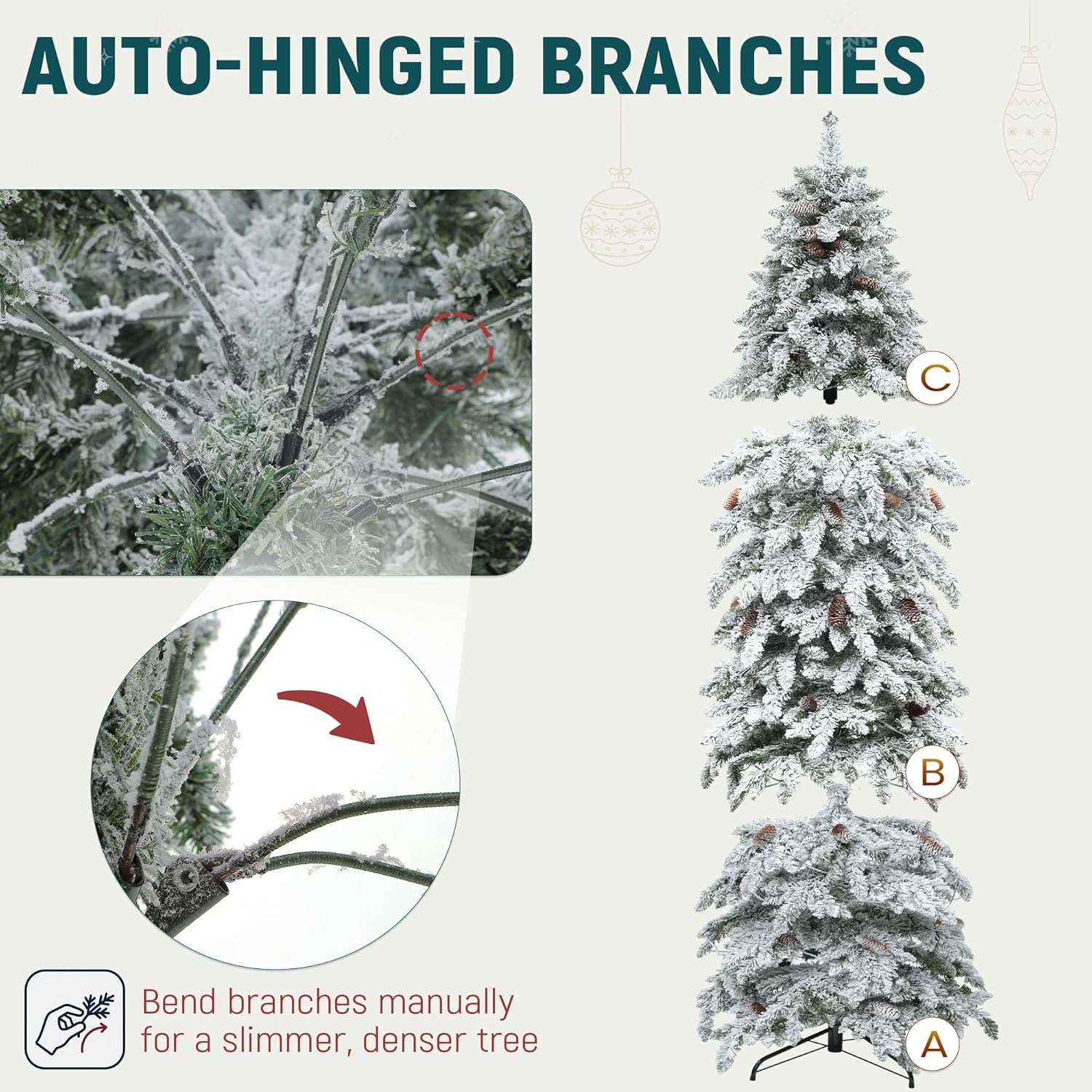 Easy Assembly: Our pencil Christmas tree comes with pre-attached hinged branches for easy setup; The product may be compressed, simply adjust the branches to fill in any obvious gaps for an elegant appearance; Pre-installed pinecones are evenly distributed under the branches and can be manually adjusted during assembly for a presentation