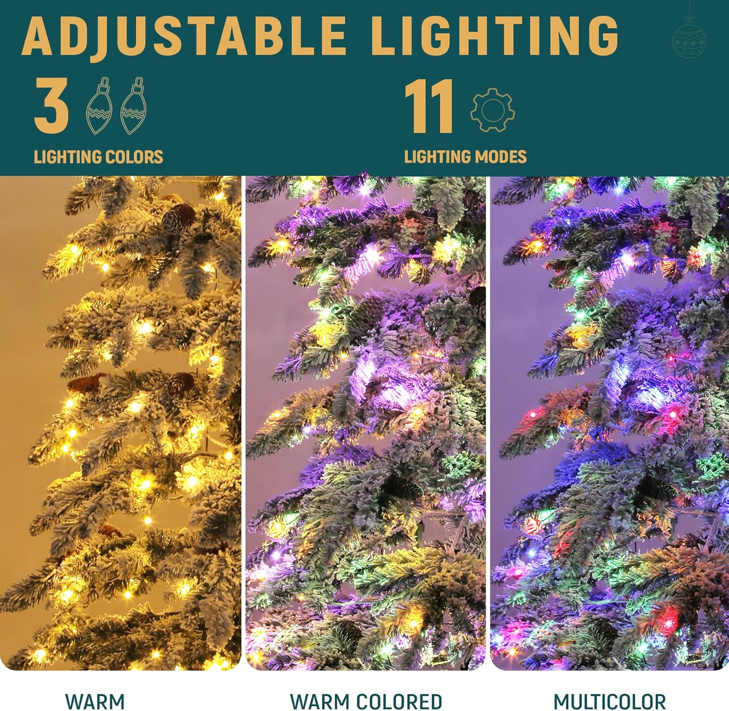 Pre-lit Design: Our pre-lit Christmas tree shines brightly with 350 pre-strung lights, offering 3 light colors + 11 modes for easy operation; Switch modes with a touch of a button to illuminate your holiday moments