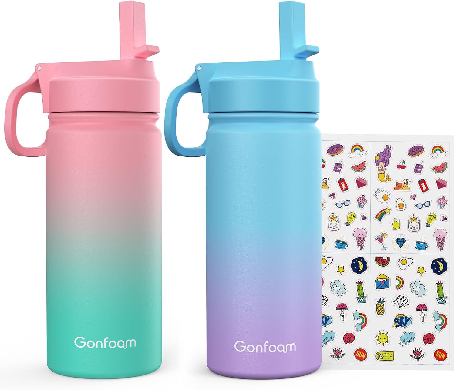 Kids Water Bottle, 2-Pack 16oz Kids Water Bottle with Stickers for School, insulated Stainless Steel Straw Cup(Pink+Blue)