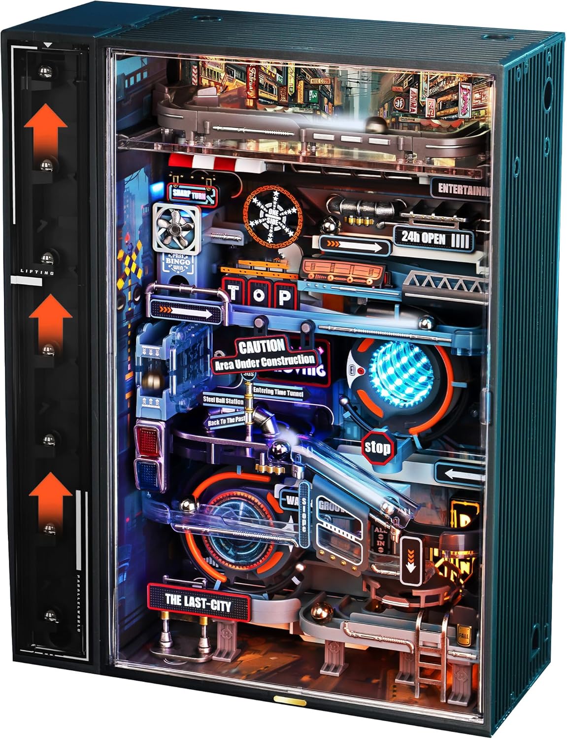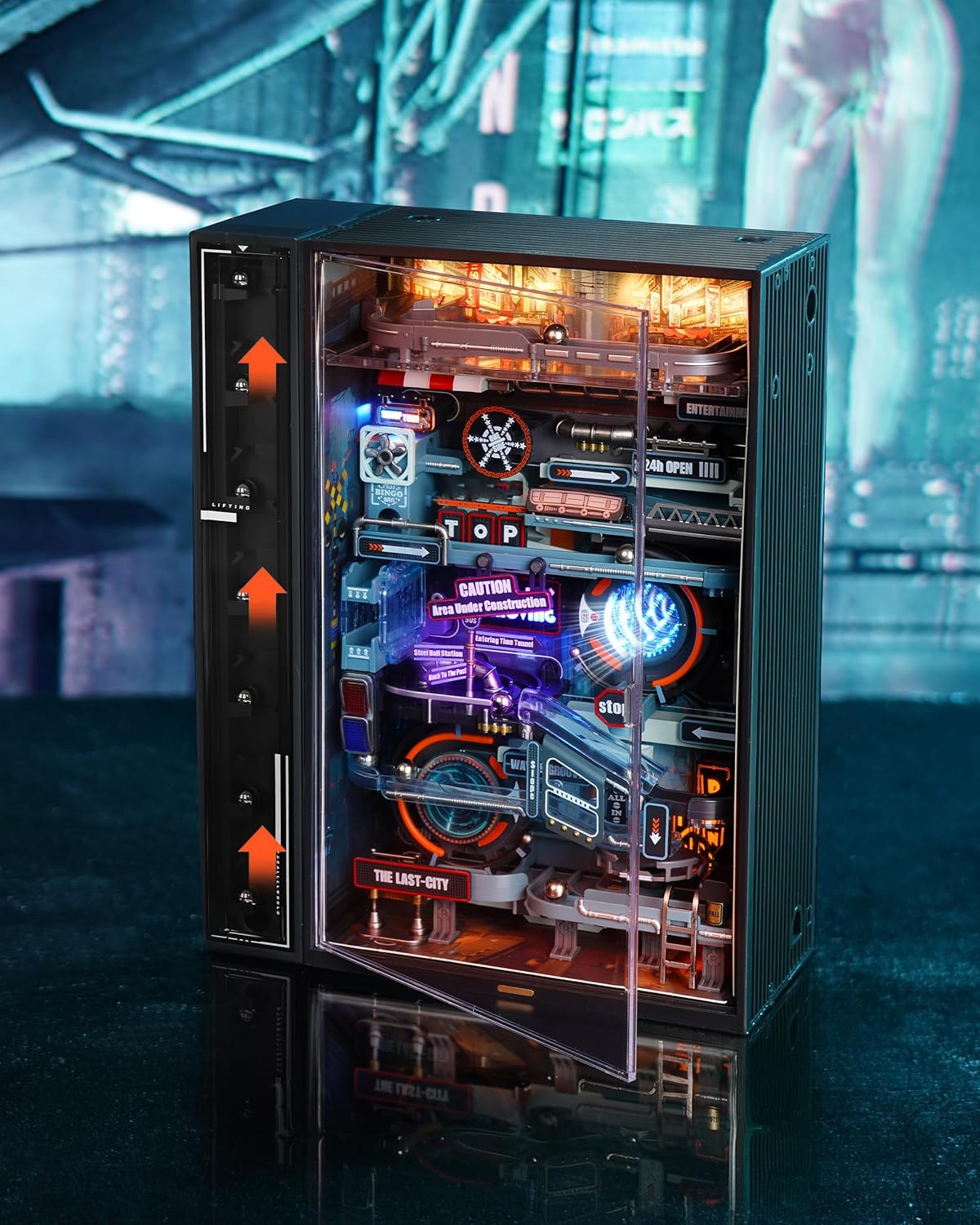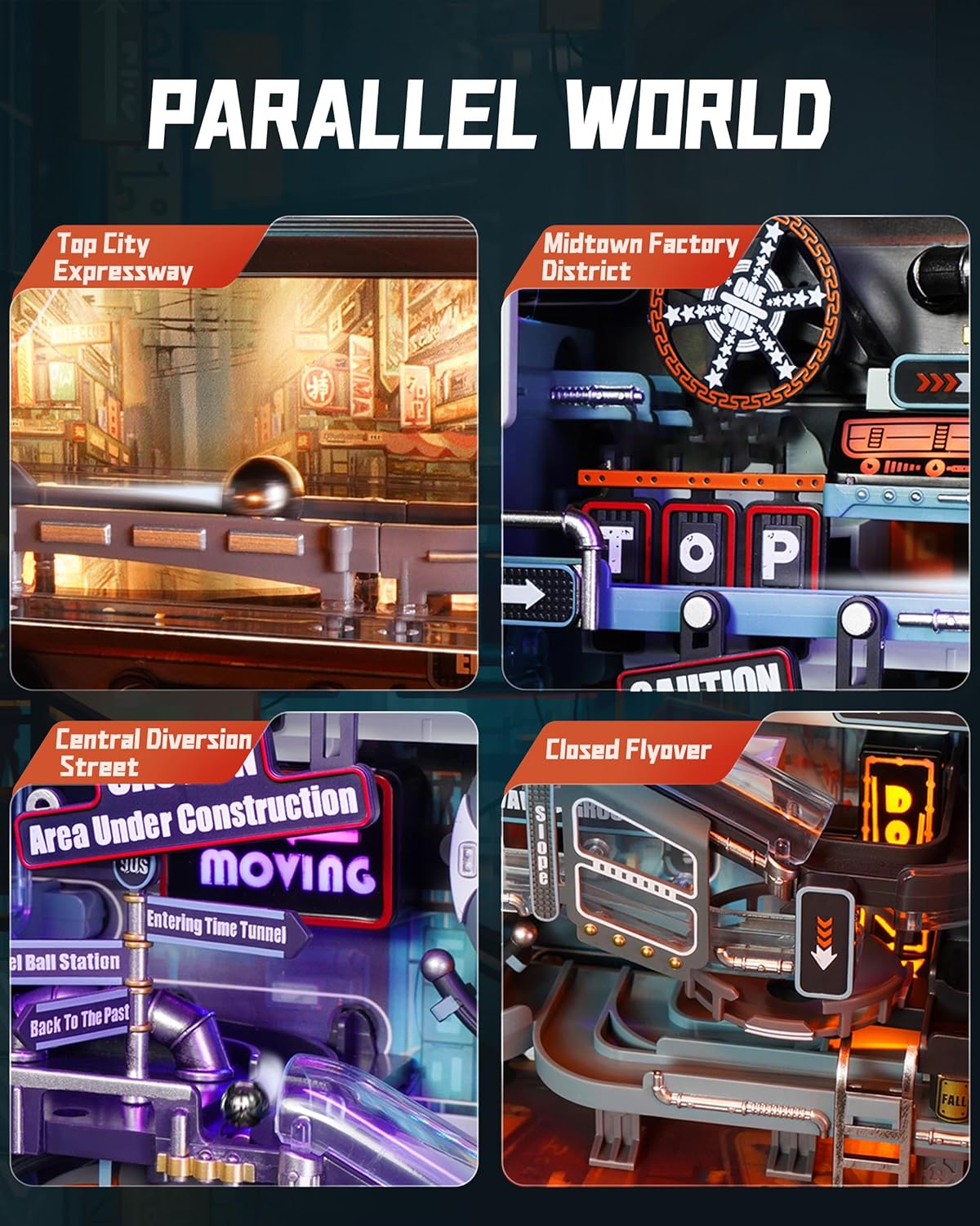 【MINIATURE PARALLEL WORLD】We have miniaturized the real world of cyberpunk into this small model, which contains four different styled worlds,the Sky City Expressway, the Bus Street Sharp Bend, the Factory District, and the Spiral Acceleration Jump. The overall track length is 186.7cm, with the steel balls circulating repeatedly, and dynamic and static modes can be freely switched.