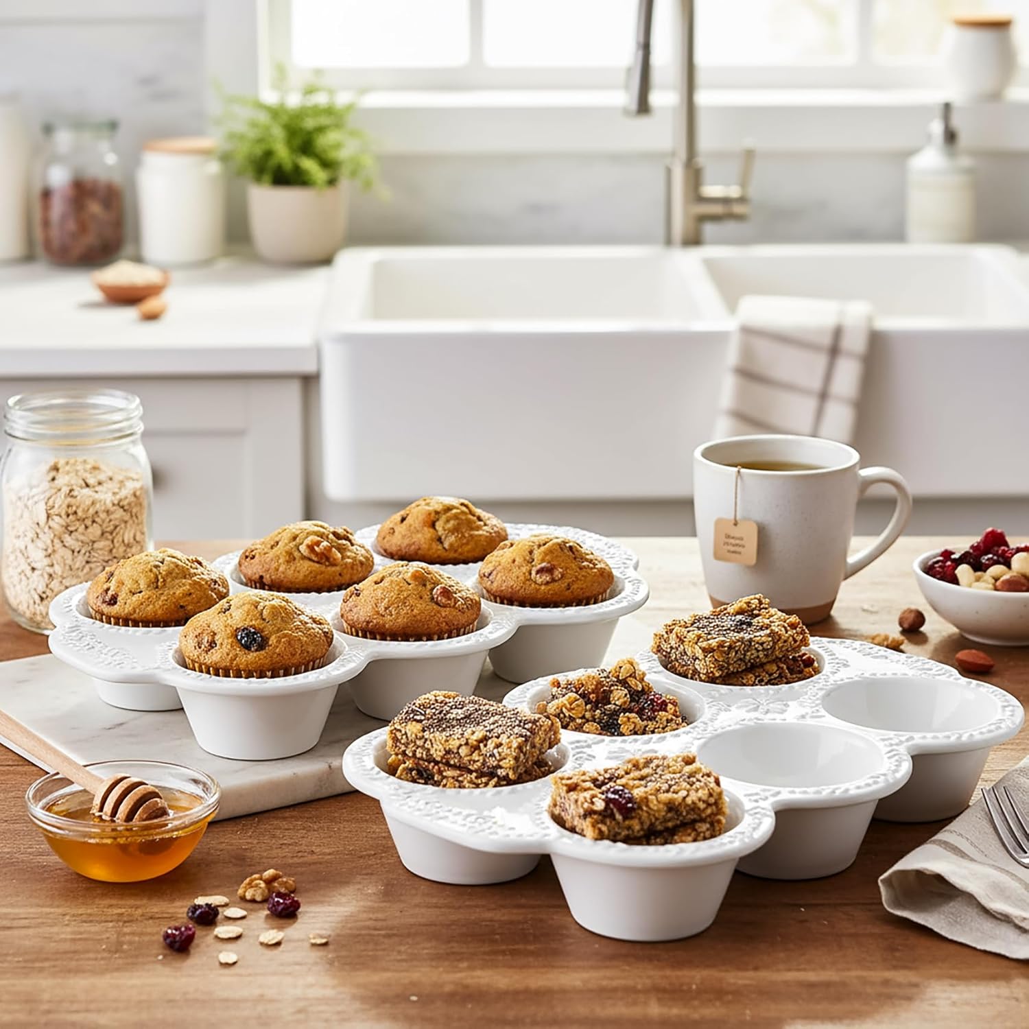 【Your Best Choice】Ideal for those enjoy baking at home, this 2-pack of Hiceeden ceramic muffin pans is a versatile addition to your bakeware collection. The surface relief texture is delicate and exquisite, adding a touch of elegance to your home anytime, anywhere.