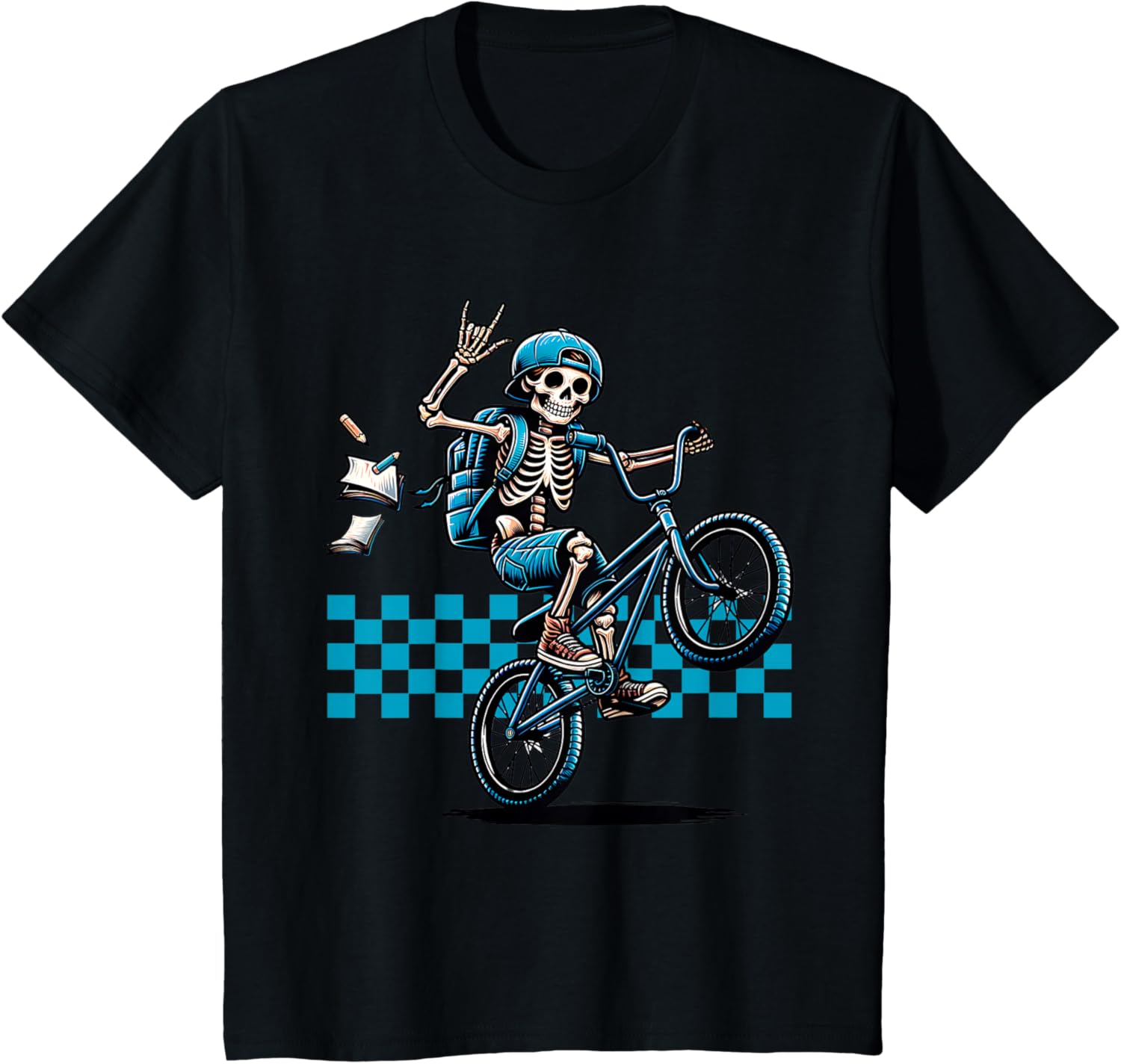 Skeleton BMX Stunt Inspire your little one's active lifestyle with this action-packed modern style boys' biking tee. The design showcases a young school boy skeleton BMX rider popping wheelies with excitement. Ideal for young boys who are passionate about biking, this graphic design is a fantastic choice for every young rider's wardrobe for their first day of school.