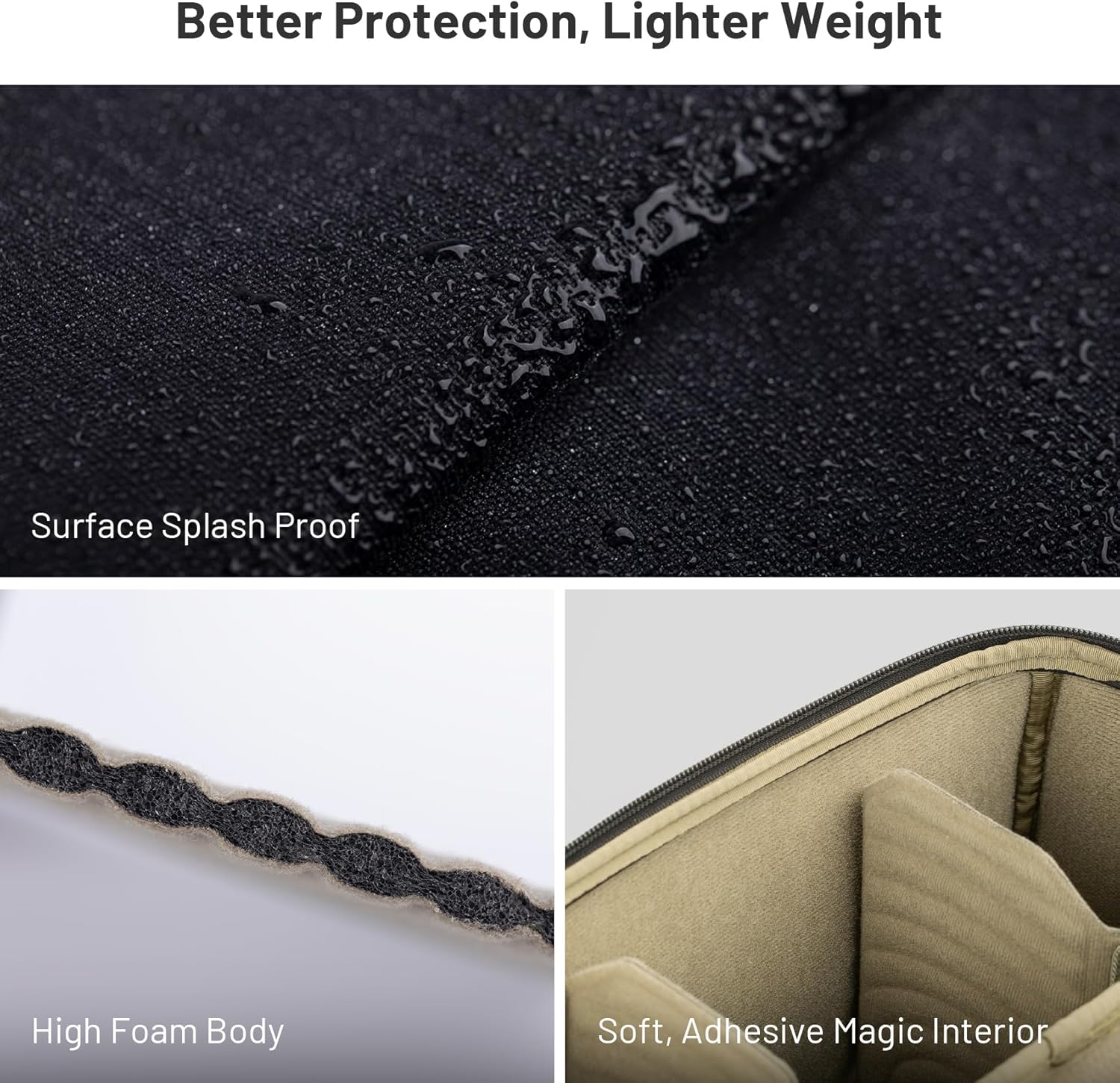 【Better Protection, Lighter Weight】The camera bag insert boasts a high-density foam body and dividers for effective shock absorption, a water-resistant surface treatment, and a soft velcro lining to prevent scratches and abrasions on your camera.