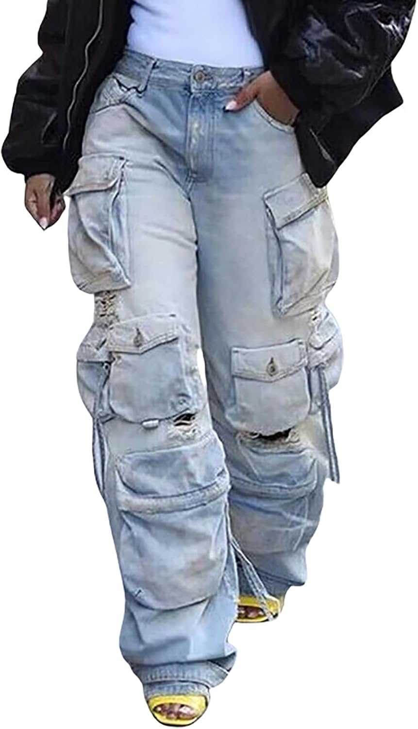 LKOUS Women's Y2K Baggy Straight Wide Leg Cargo Jeans, Streetwear High Waisted Denim Pant