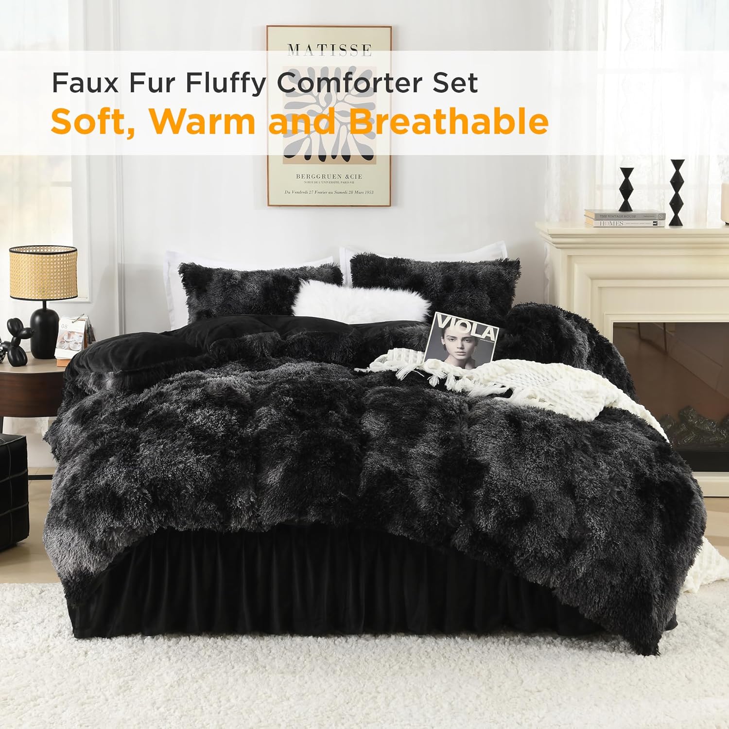 Litanika Tie-Dyed Black Fluffy Comforter Queen Size, Luxury Plush Faux Fur Bedding, Ultra Soft Velvet Fuzzy Bed Set 3 Pieces(1 Shaggy Comforter, 2 Pillowcases)