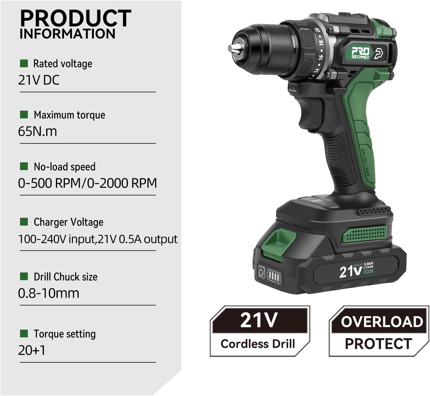 What You Will Get : (1) Prostormer Brushless Drill, (2) 2.0Ah Lithium-ion Batteries, (1) Charger, (9) Sockets, (6) Drill Bits, (8) Screwdriver Bits, (1) Flexible Shaft, (1) Storage Box