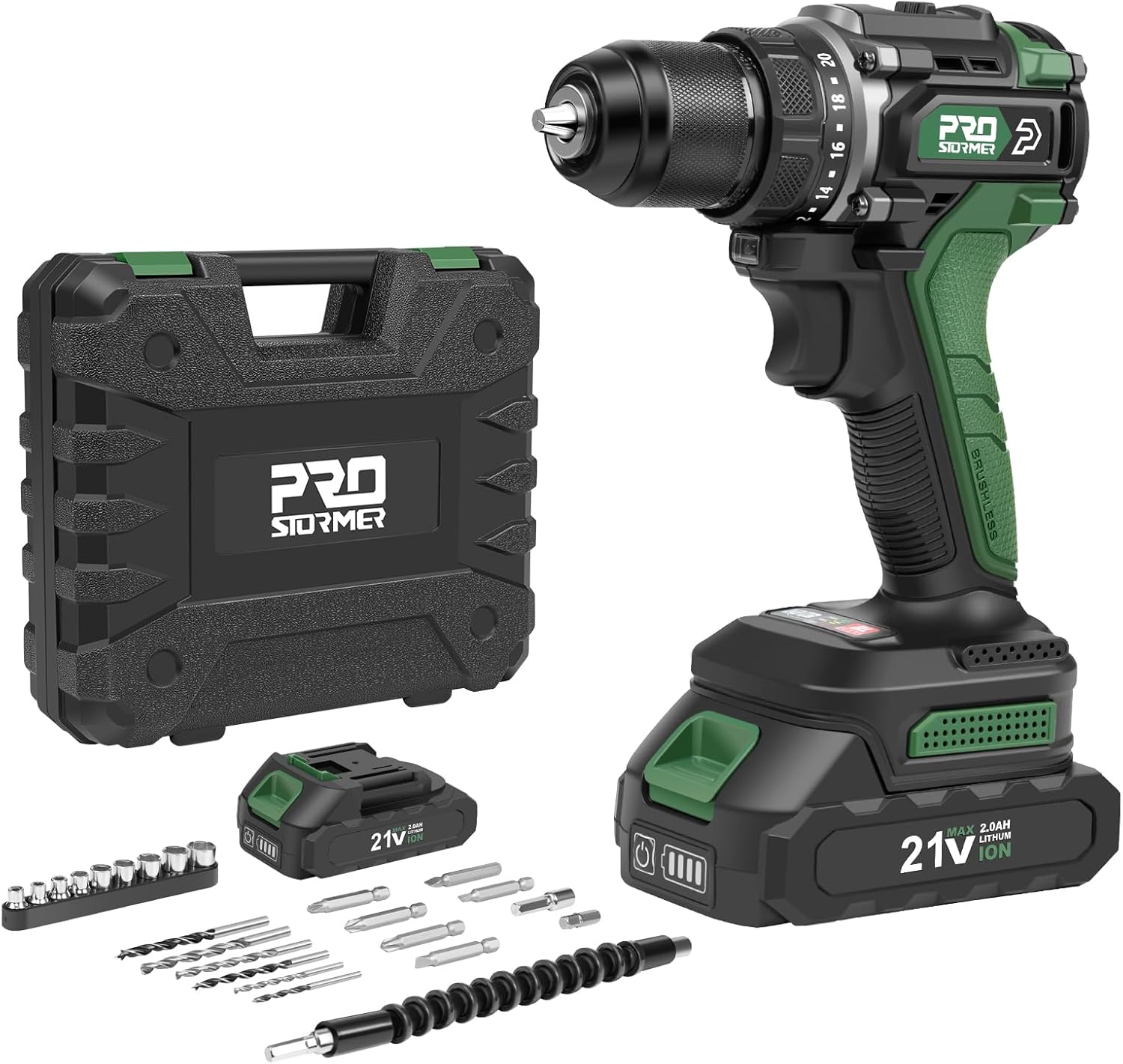What You Will Get : (1) Prostormer Brushless Drill, (2) 2.0Ah Lithium-ion Batteries, (1) Charger, (9) Sockets, (6) Drill Bits, (8) Screwdriver Bits, (1) Flexible Shaft, (1) Storage Box