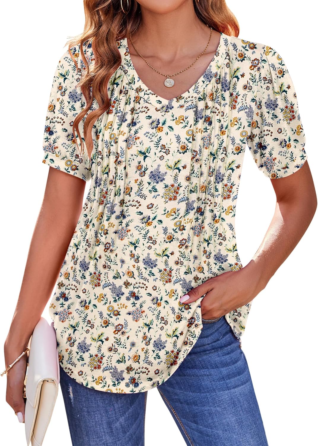 Zeagoo Women's Puff Short Sleeve Boho Shirts Casual V Neck Floral Solid Summer Blouse Pleated Tunic Top
