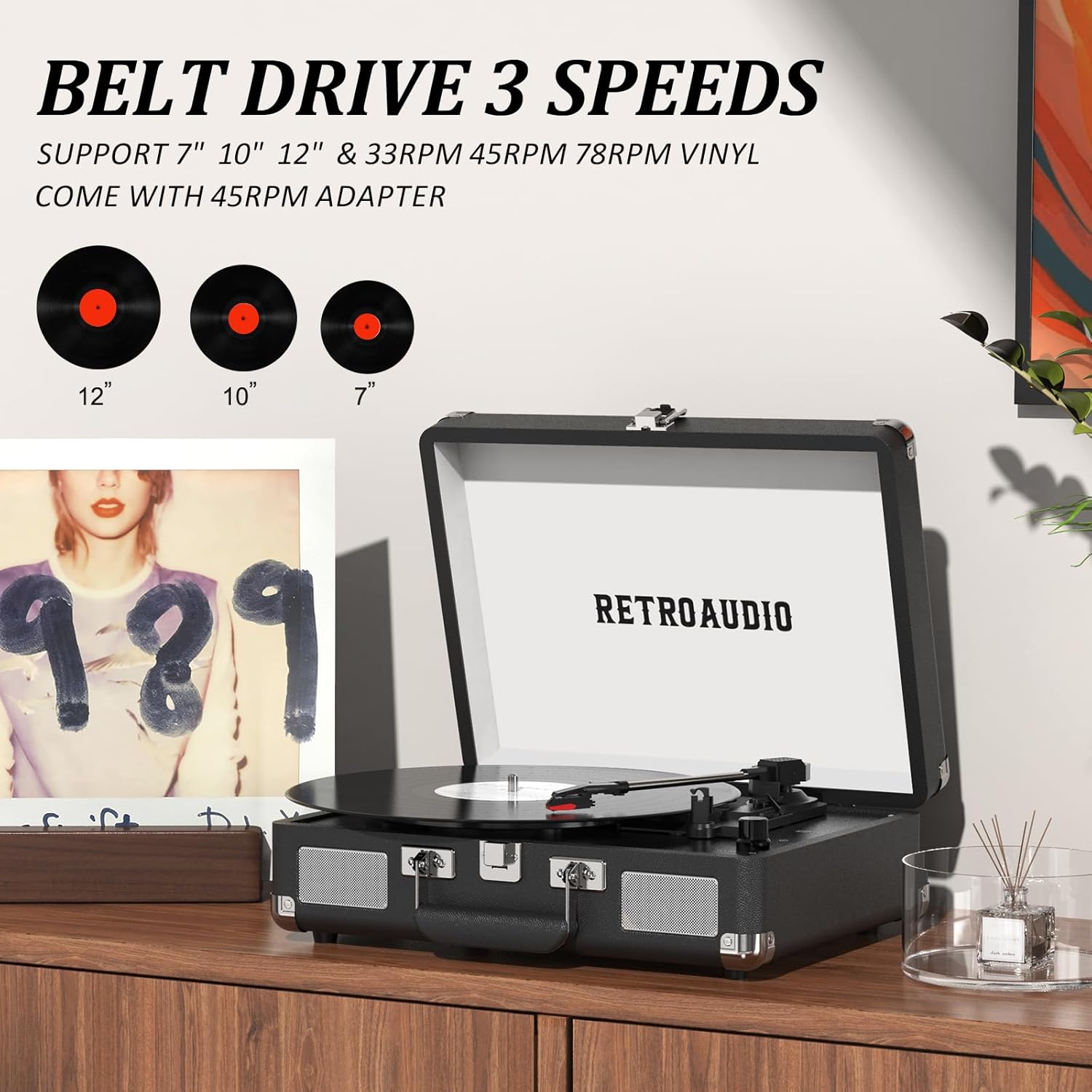 【3 Velocidades y 3 Tamaños de Tabla de Mezcla】 Compatible con vinilos de 33 1/3, 45, 78RPM y 7", 10", 12". Equipado con una mesa de mezclas reforzada y pies aislantes de sonido, puede prevenir eficazmente la vibración causada por la reproducción y restaurar la música más auténtica para usted.
